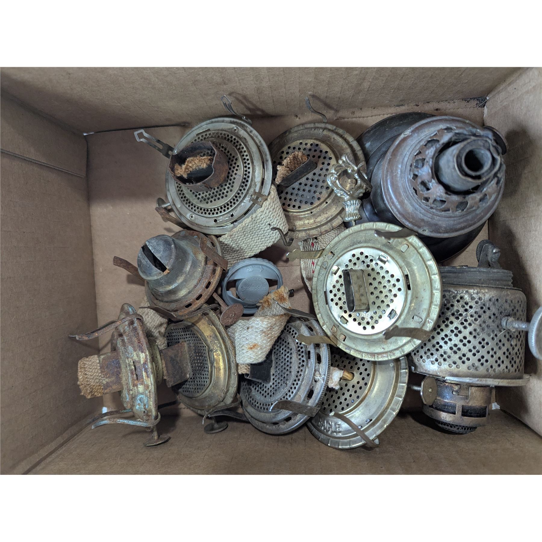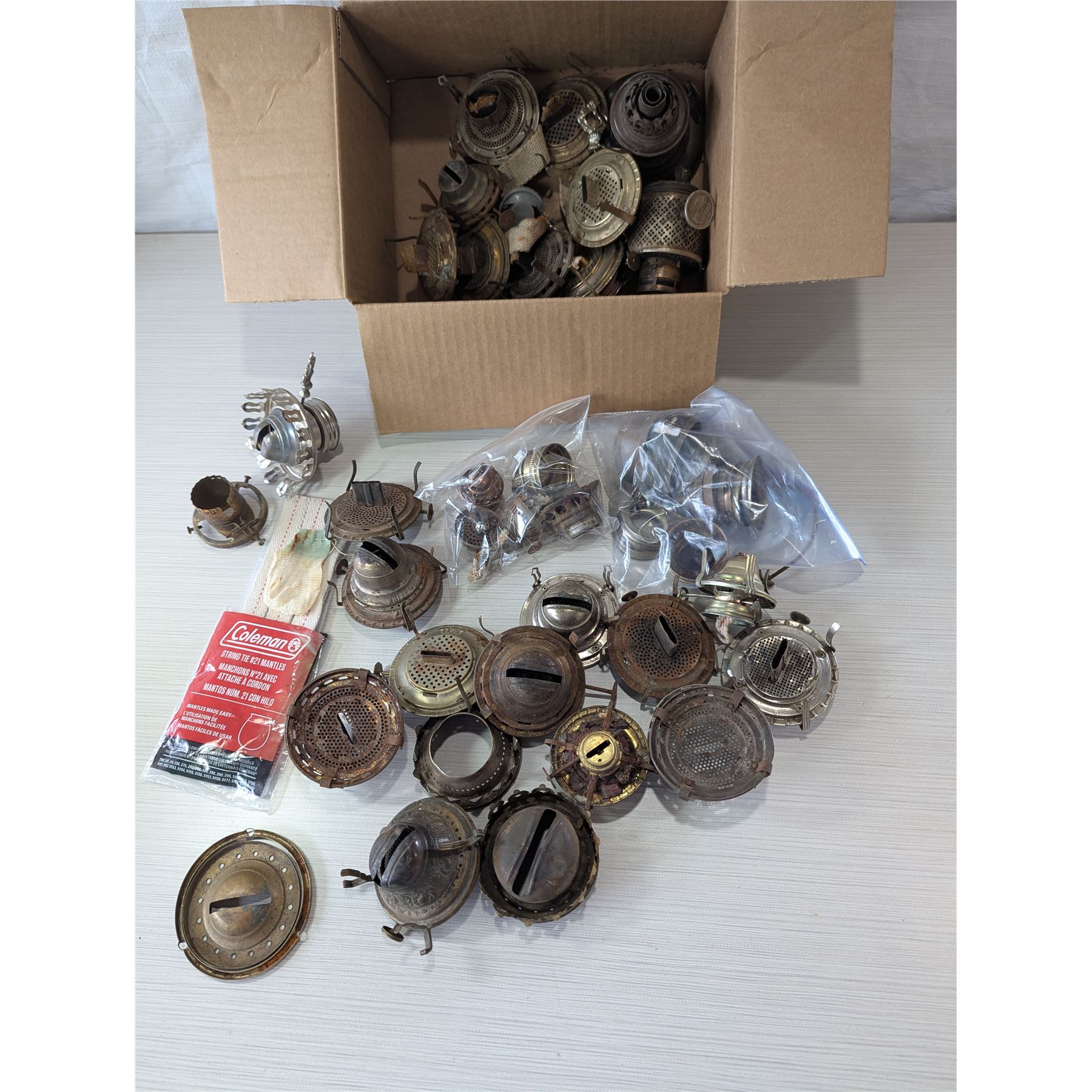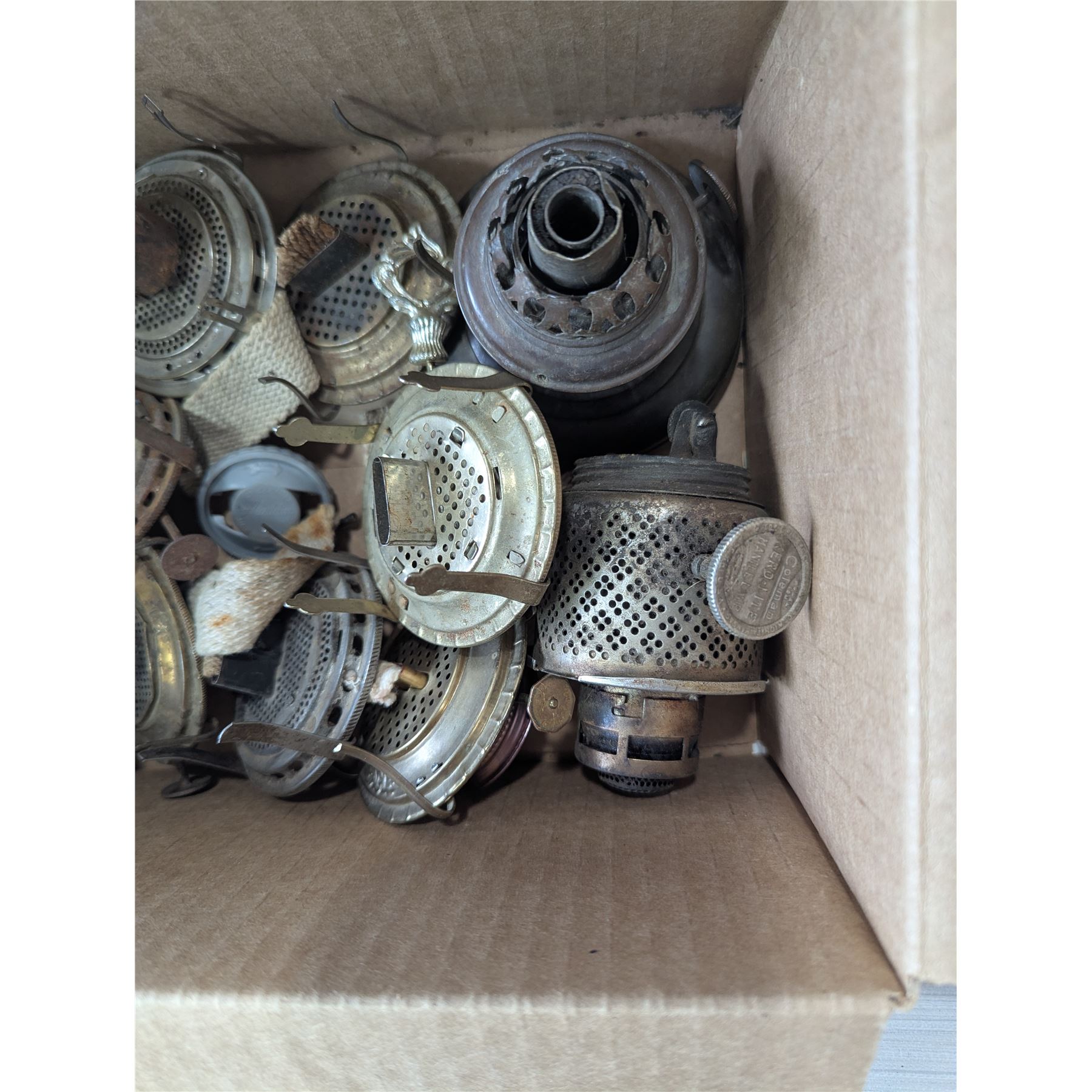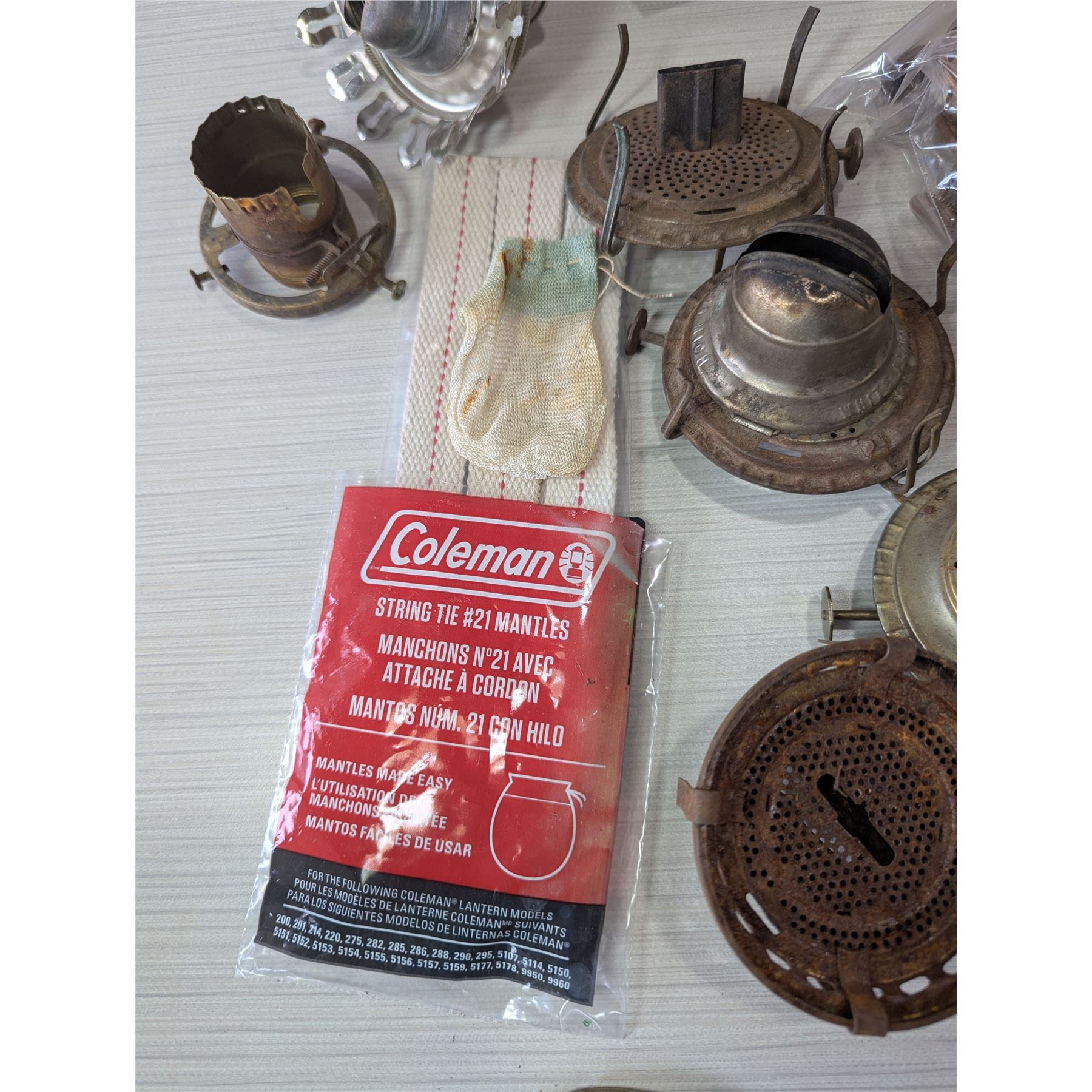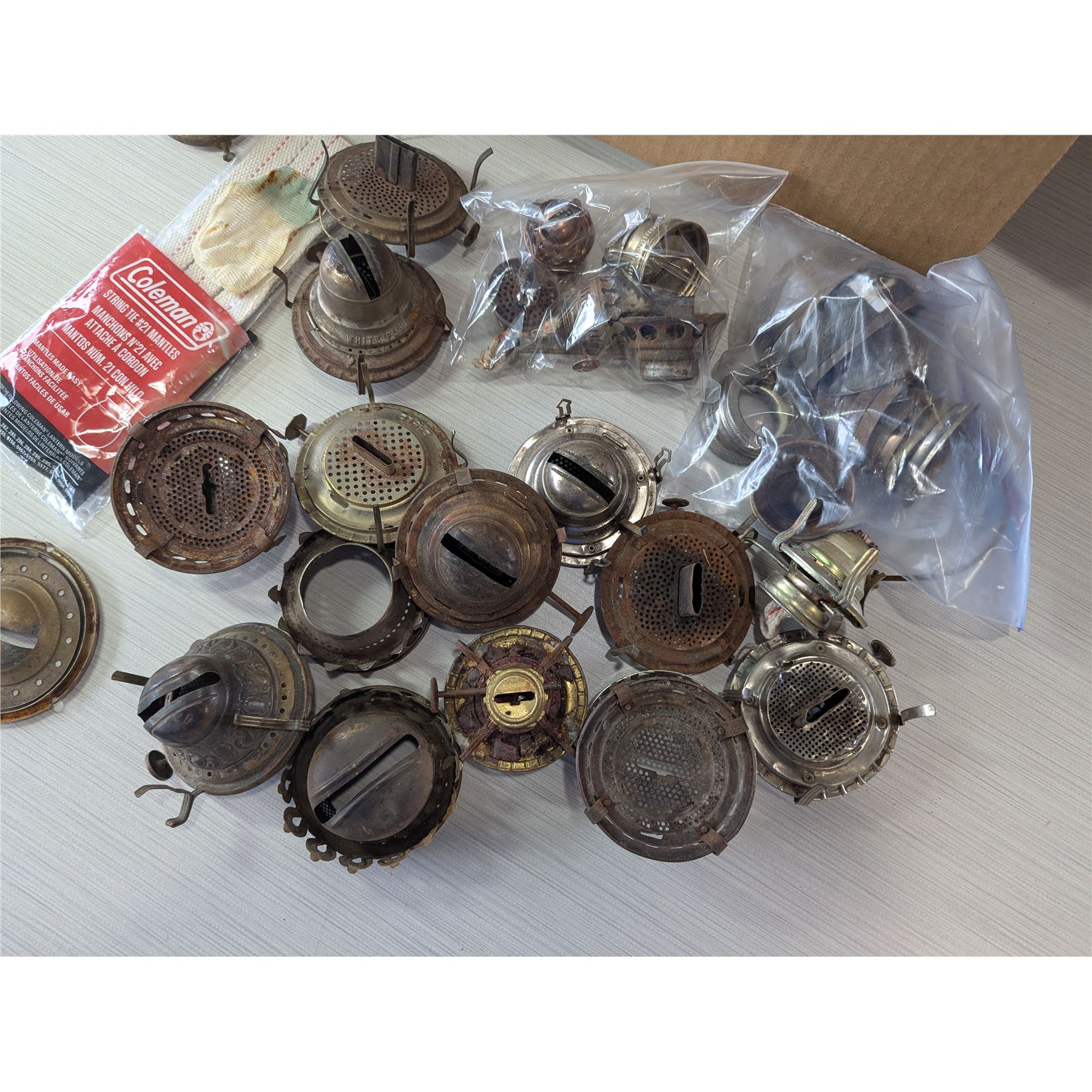 ANTIQUE Kerosene Oil Lamp parts approximately 35 various pieces. Strong tie mantles and new 3/4" wicks.