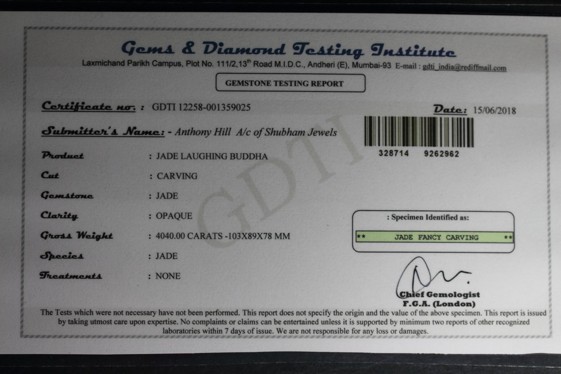 INCREDIBLE RARE MUSEUM SIZE 4040 CT CERTIFIED HAND CARVED JADE LAUGHING BUDDHA.UNHEATED 100 % NATURAL NO TREATMENTS.THIS BEAUTIFUL JADE BUDDHA MEASURES 103 x 89 x78 mm.JADE IS MOST VALUED FOR IT\'S METAPHYSICAL PROPERTIES.JADE IS REVERED IN ANCIENT CULTURES AS WELL AS TODAY.THE BUDDAH BRINGS HARMONY AND TRANQUILITY TO YOUR MIND AND BODY. BEAUTIFUL CARVING. THIS NATURAL JADE BUDDHA CARVING IS AMAZING.PICTURES CAN NOT BEGIN TO UNVEIL THE BEAUTY OF THIS FINE ART CARVING.WHAT A MAGNIFICANT ADDITION TO ANY ONE\'S COLLECTION. This is an old carving.