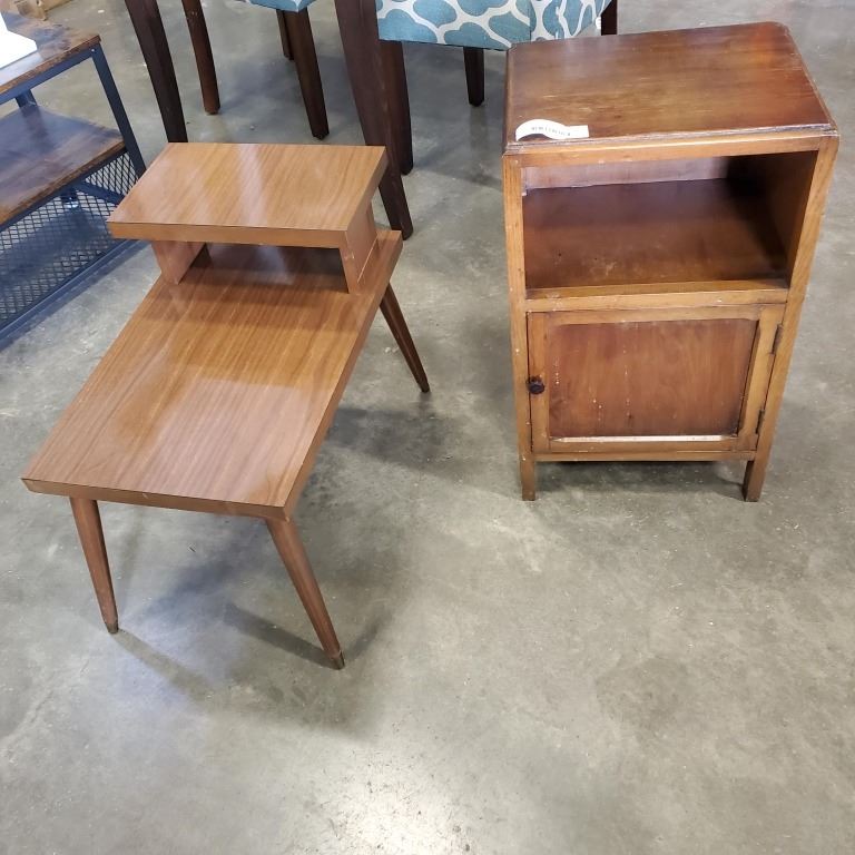 ANTIQUE OAK NIGHTSTAND AND MCM SIDE TABLE