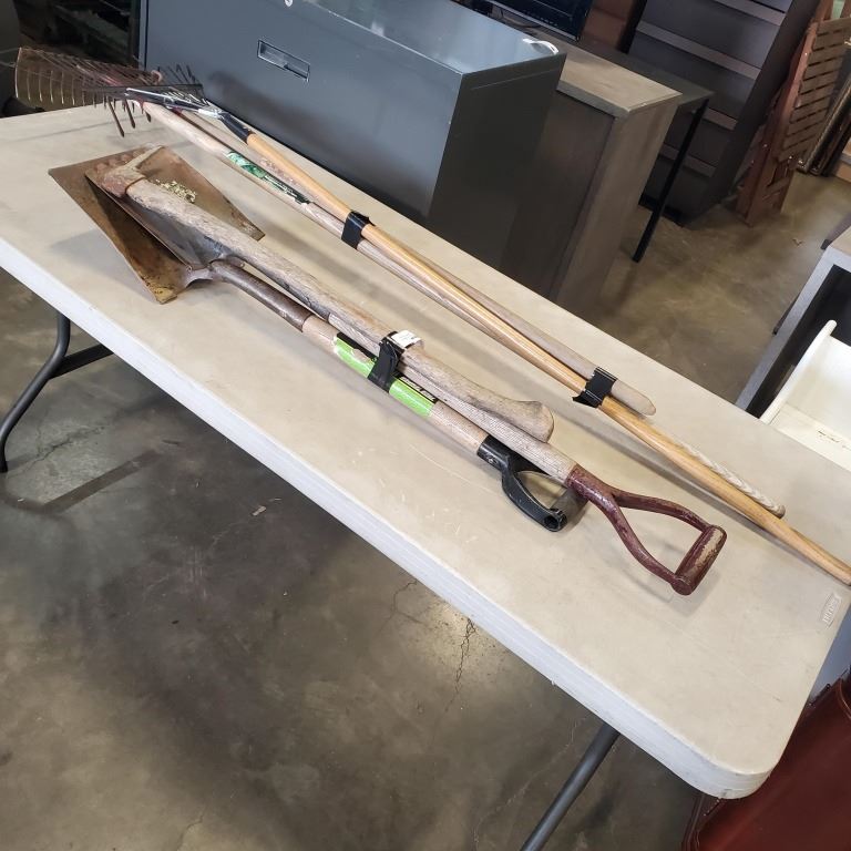 ANTIQUE SHOVELS AND PICK WITH RAKES