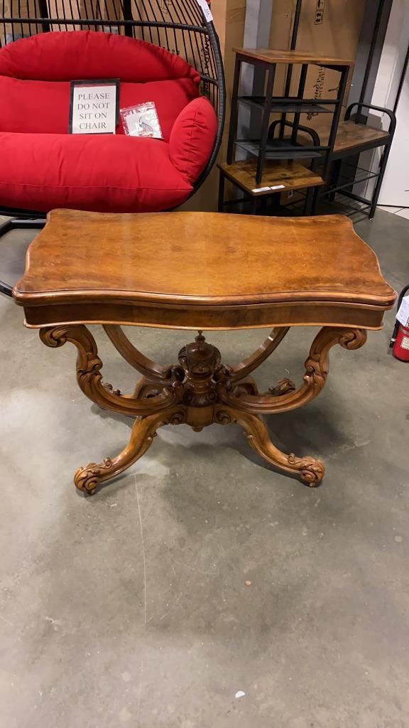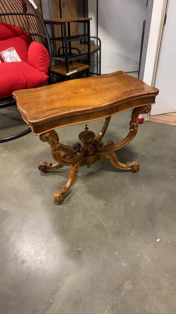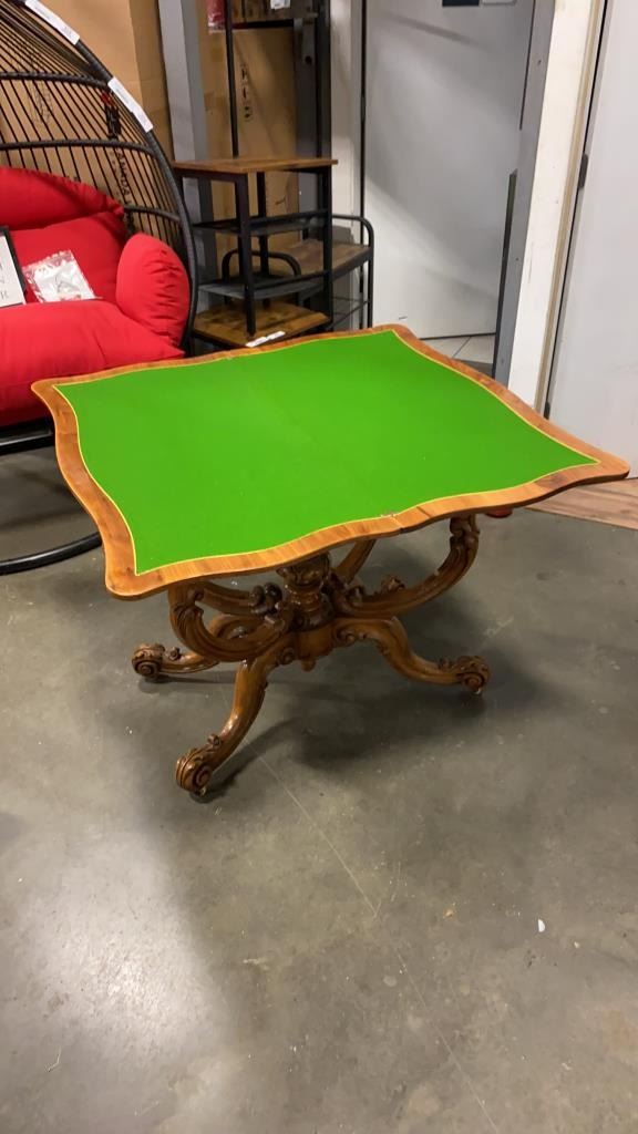 ANTIQUE WALNUT FLIP OVER GAMES TABLE, GORGEOUS CAGE STYLE BASE, ORIGINAL CASTORS, FELT IN PERFECT CONDITION