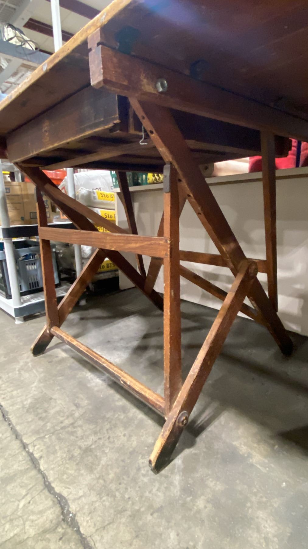 ANTIQUE WOOD 60"W X 36"D ADJUSTABLE DRAFTING STYLE WORK TABLE WITH MOBILE DRAFTING CHAIR
