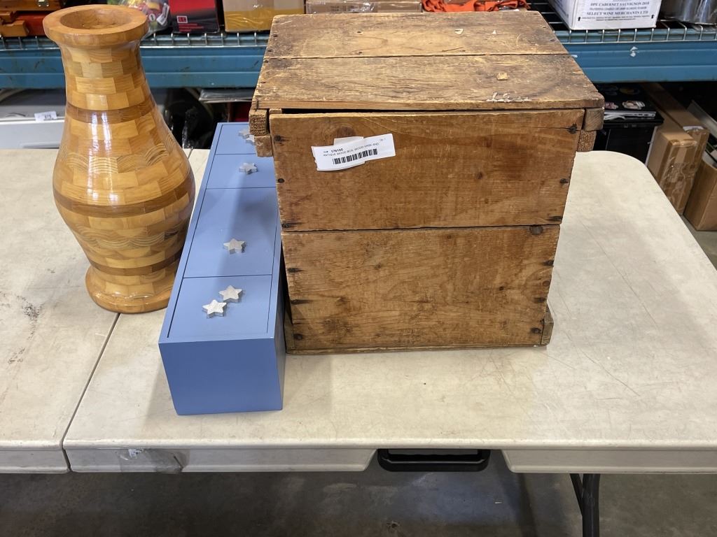 ANTIQUE WOOD BOX, WOOD VASE AND WALL SHELF