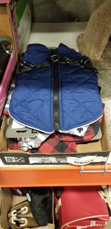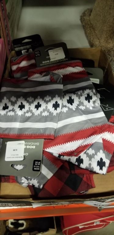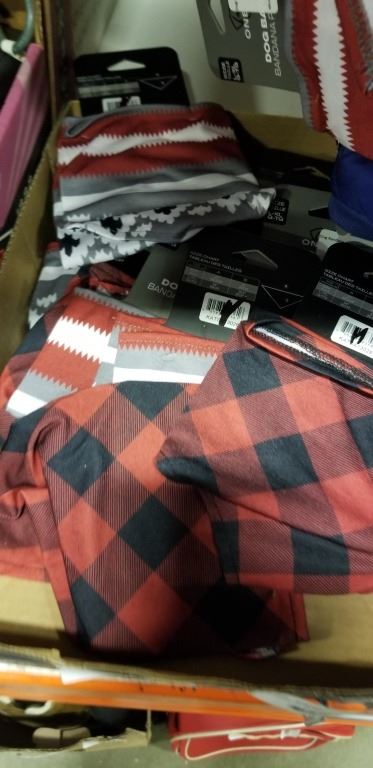 APPROX 25 NEW DOG BANDANAS ASSORTED SIZE AND NEW SIZE M DOG JACKETY WITH BUILT IN HARNESS