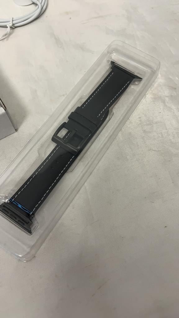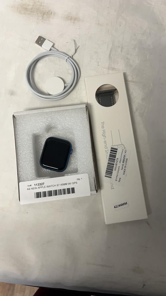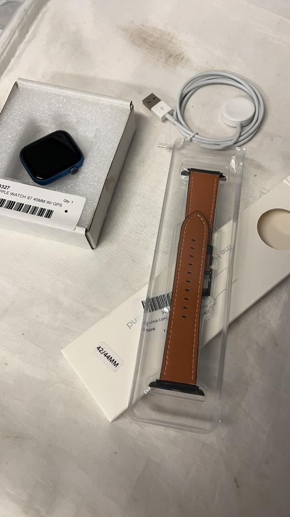 AS NEW APPLE WATCH S7 45MM W/ GPS AND LTE CELLULAR, NEW GENUINE LEATHER BAND, AND CHARGER - WATCH RE