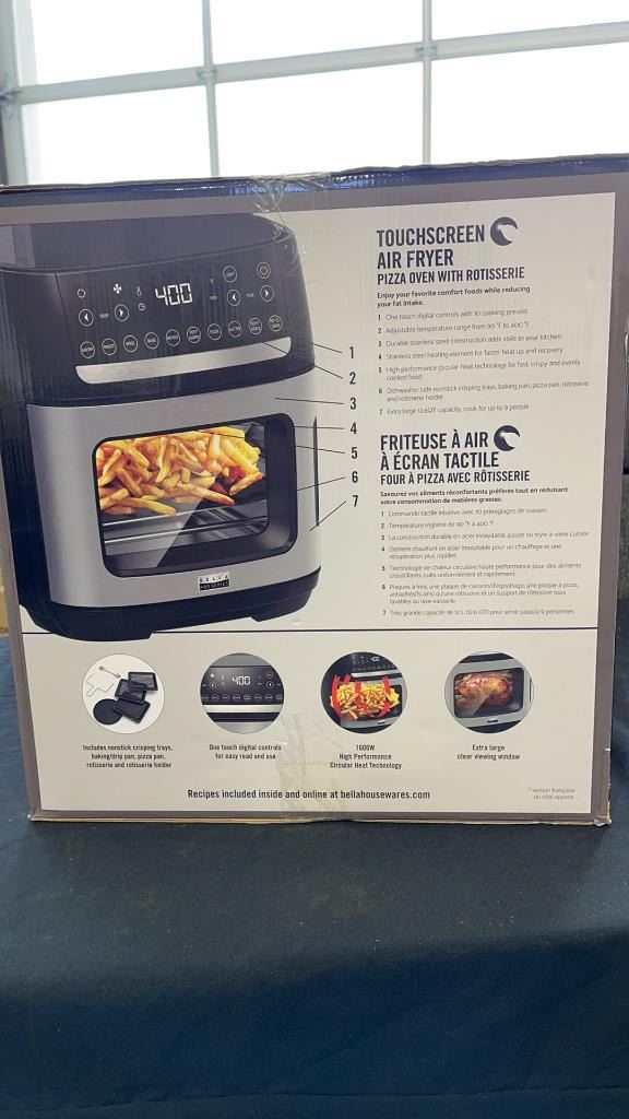 AS NEW BELLA PRO SERIES TOUCHSCREEN AIR FRYER PIZZA OVEN WITH ROTISSERIE - RETAIL $289