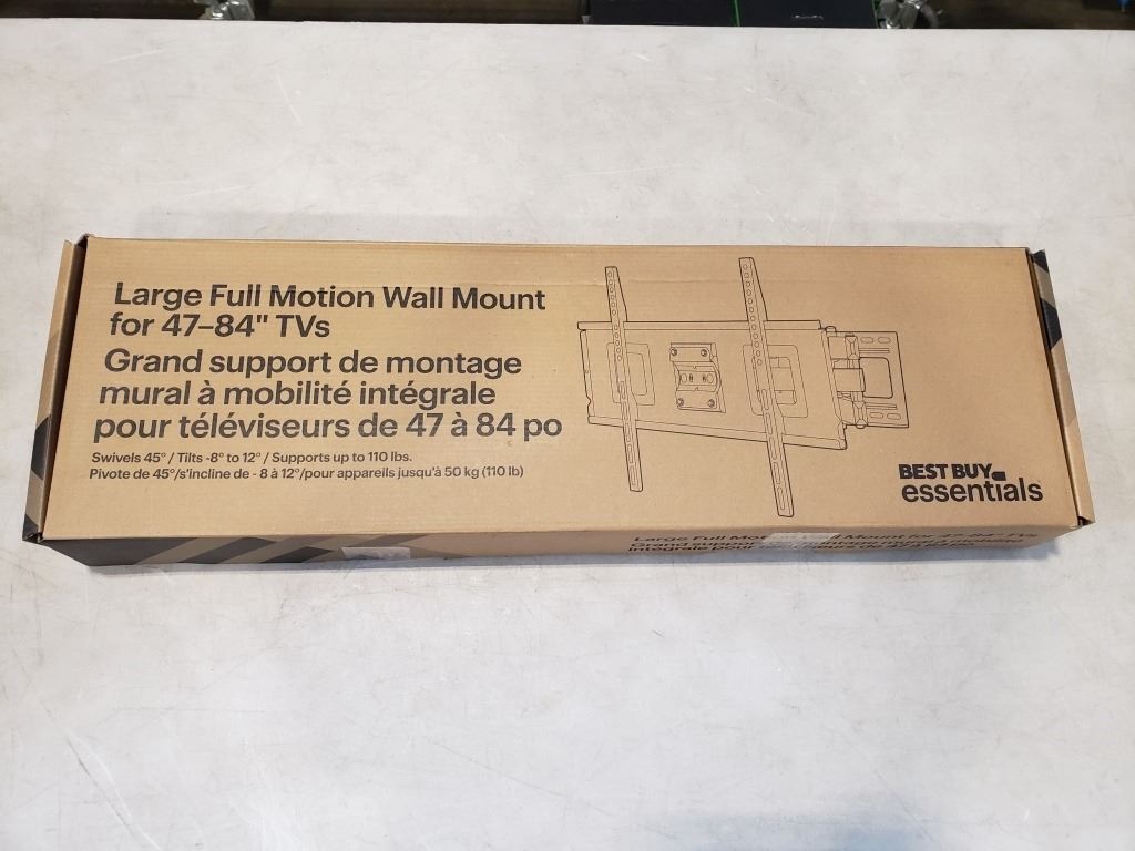 AS NEW BEST BUY ESSENTIALS 47-84 INCH FULL MOTION TV WALL MOUNT, SUPPORTS UP TO 110 LBS - RETAIL $119