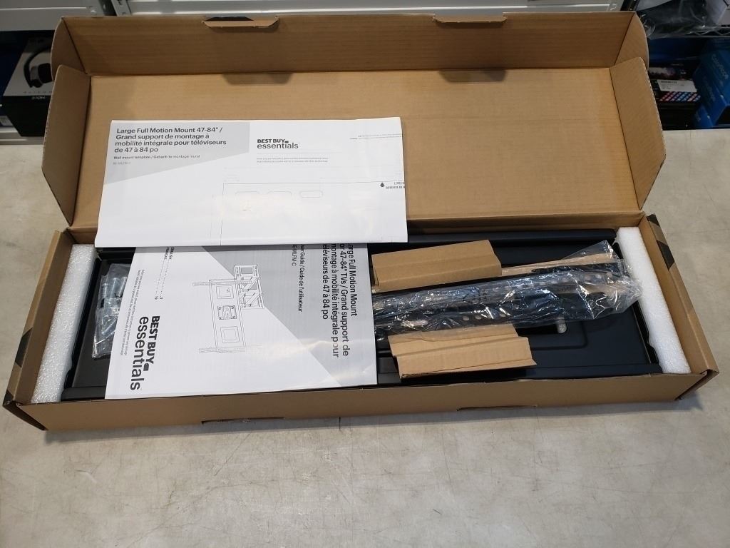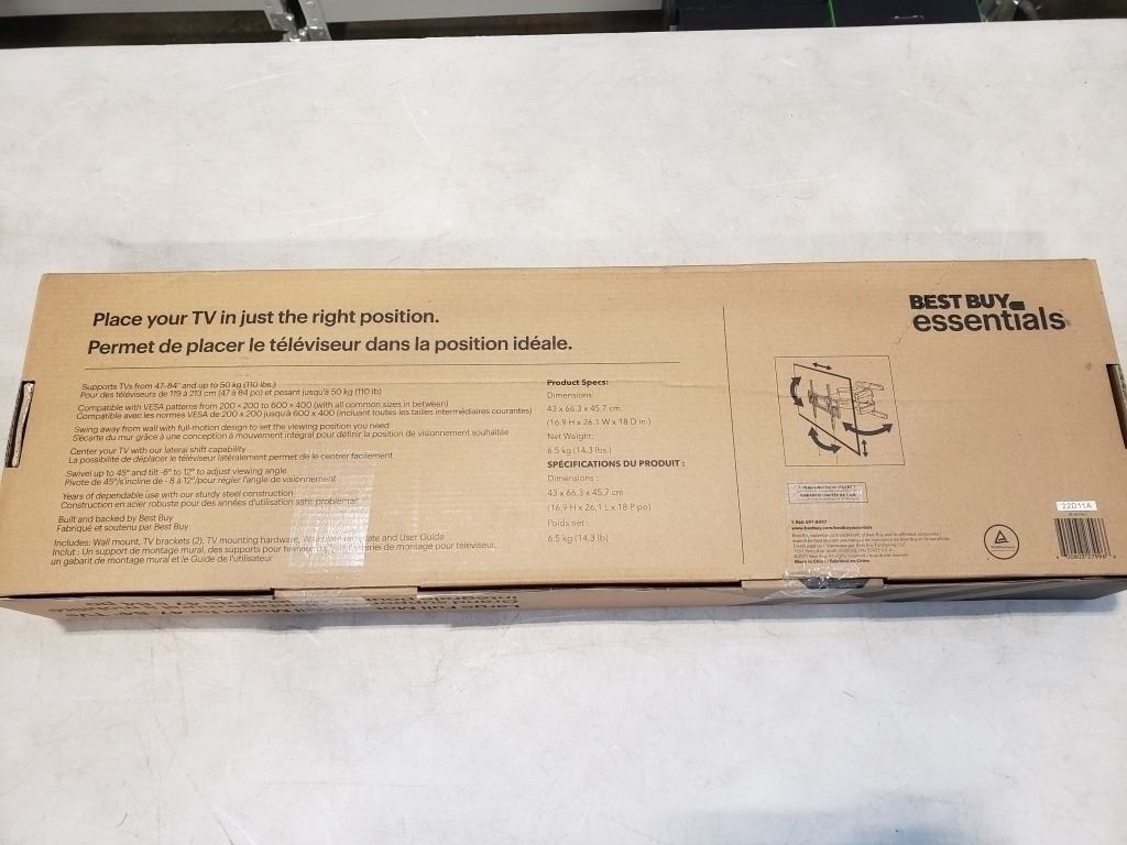AS NEW BEST BUY ESSENTIALS 47-84 INCH FULL MOTION TV WALL MOUNT, SUPPORTS UP TO 110 LBS - RETAIL $11