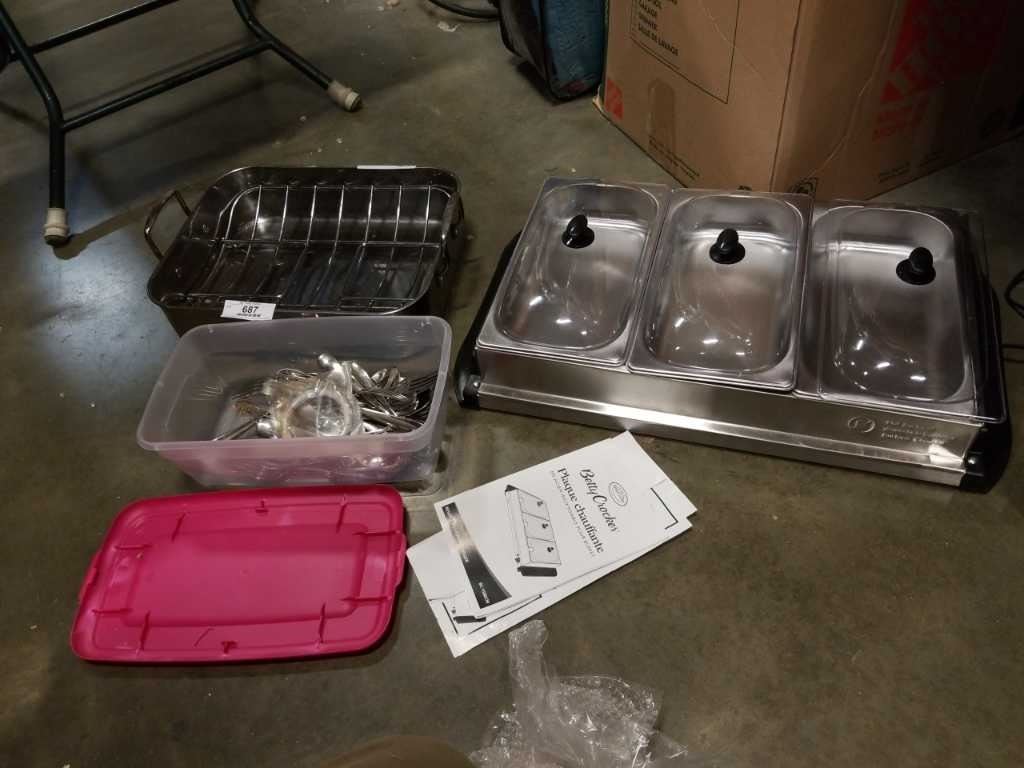 AS NEW BETTY CROCKER FOOD WARMER AND ROASTING PAN WITH CUTLERY