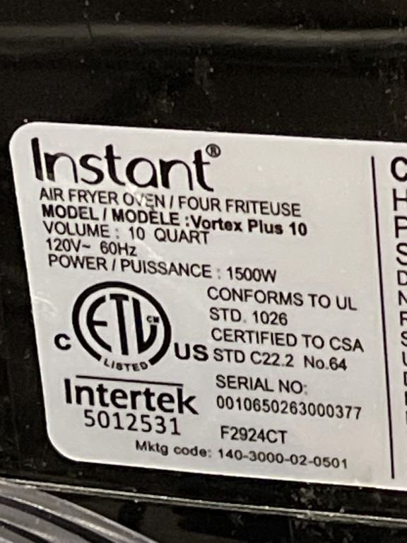 AS NEW DEMO INSTANT POT VORTEX PLUS 10QT AIR FRY OVEN - TESTED WORKING, RETAIL $199