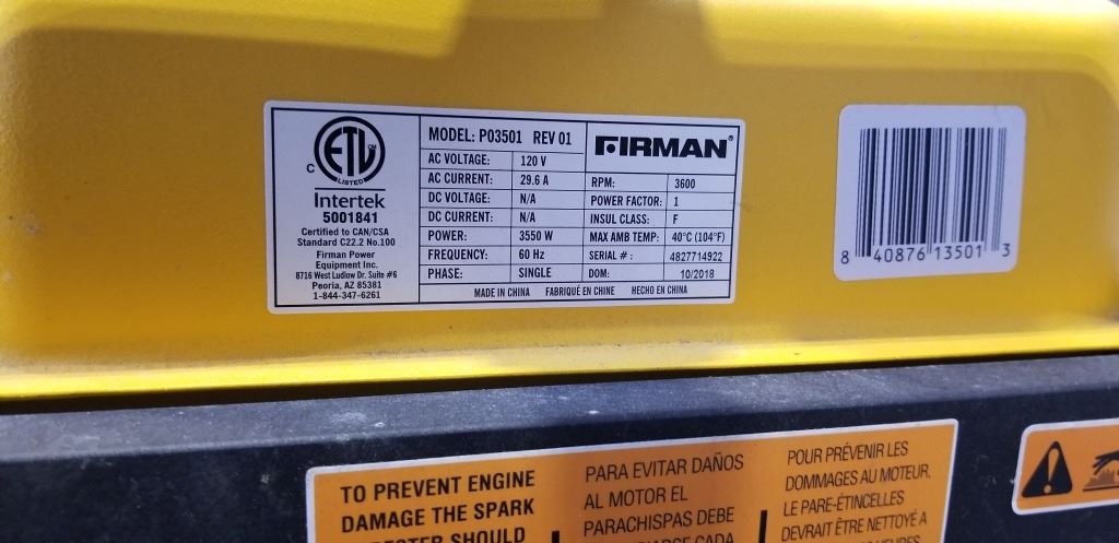 AS NEW FIRMAN GAS GENERATOR 3550/4550, TESTED WORKING, ONLY 1 HOUR USE