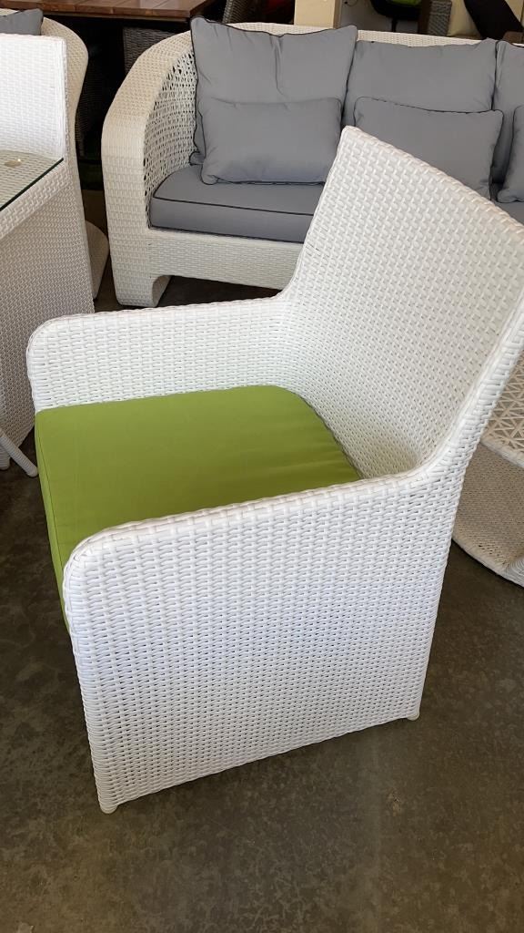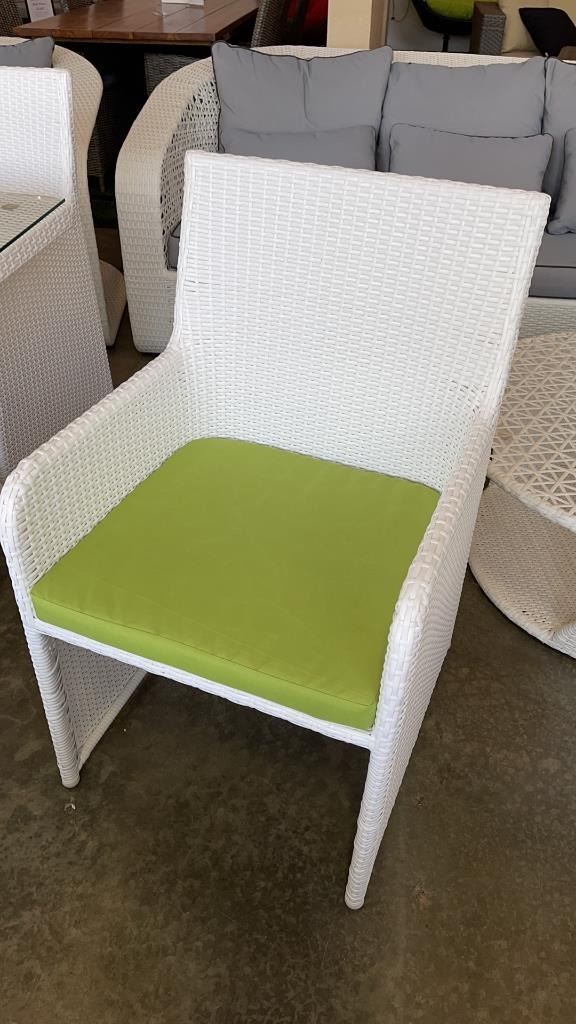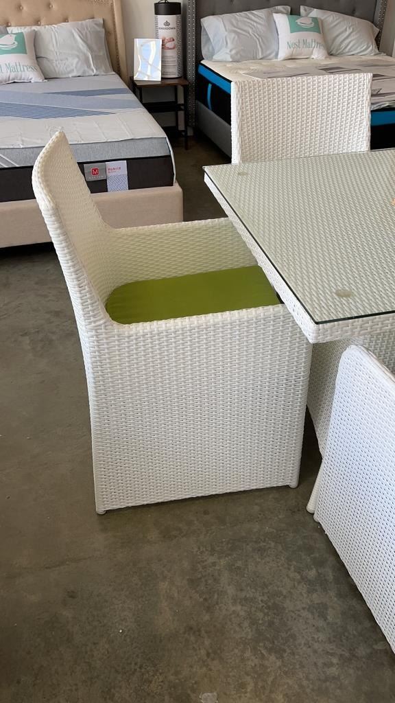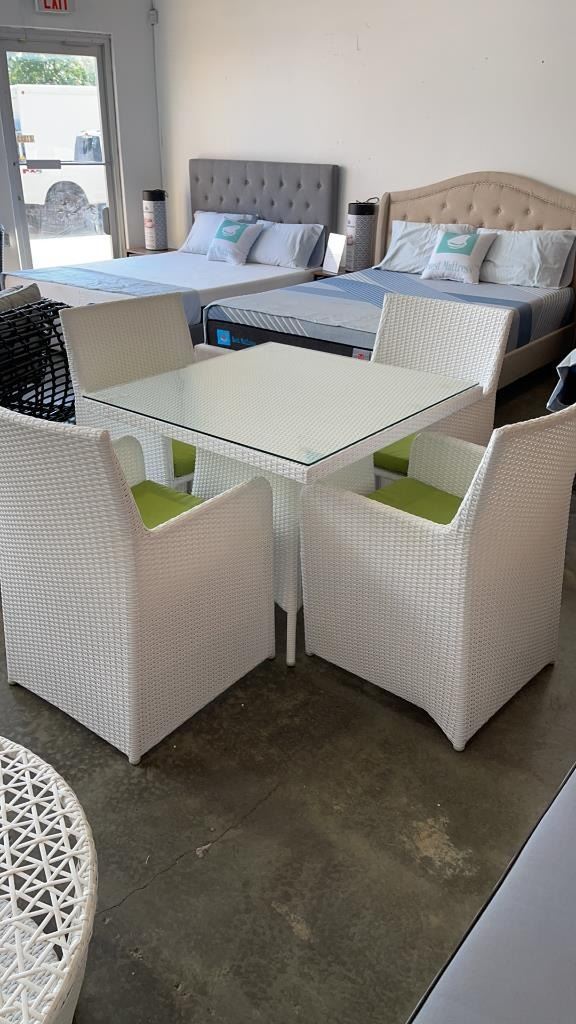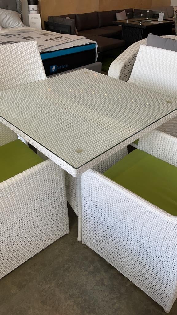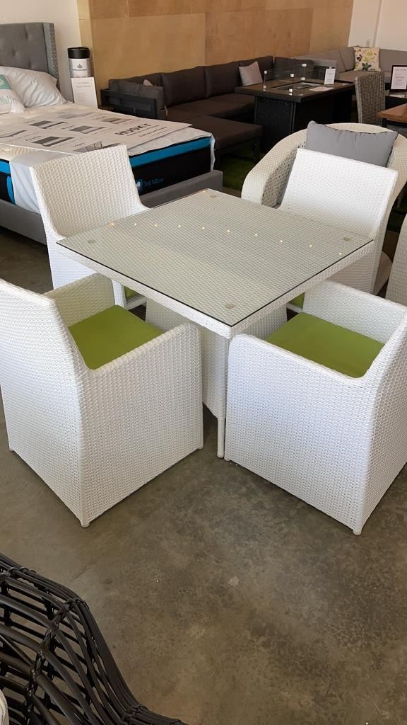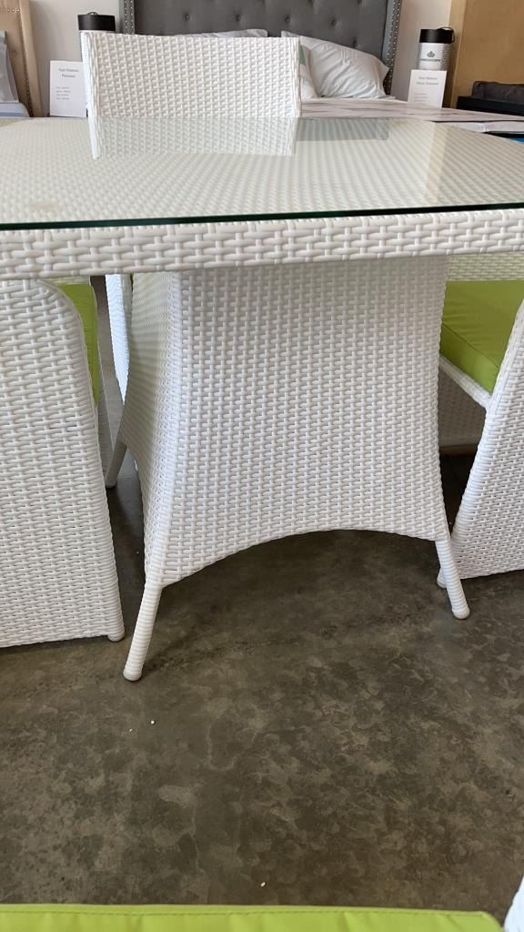 AS NEW FLOOR MODEL WHITE 5 PIECE OUTDOOR DINING TABLE W/ TEMPERED GLASS TOP, FULLY ASSEMABLED ALUMINUM FRAME - RETAIL $999