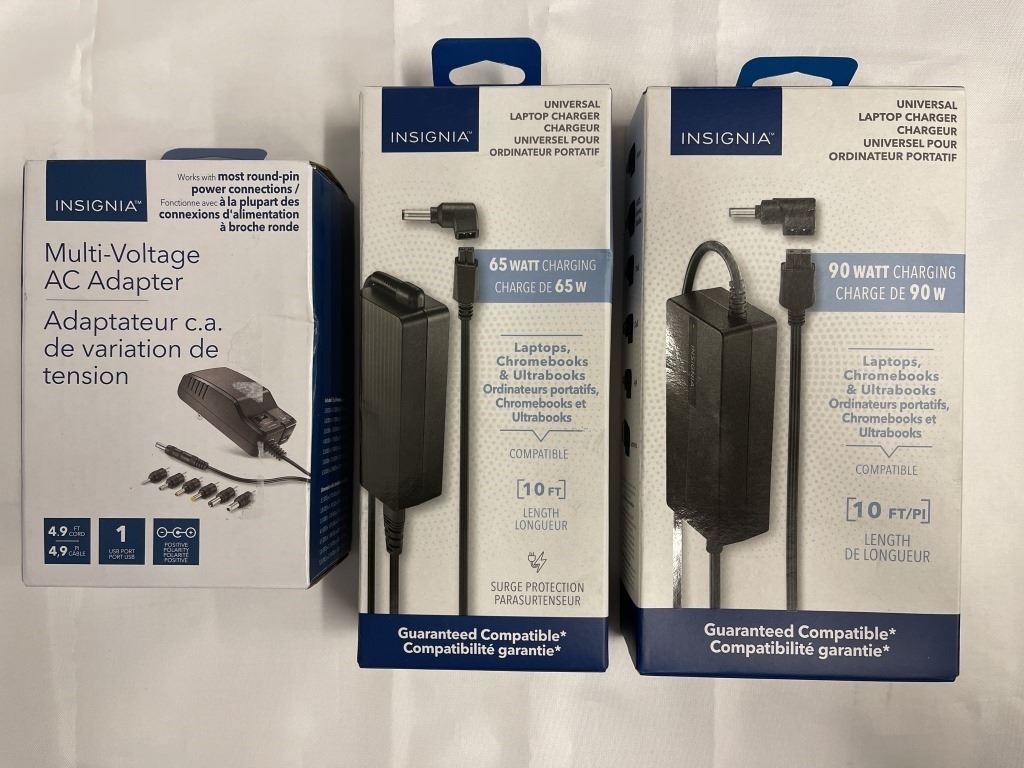 AS NEW INSIGNIA 90 WATT AND 65 WATT UNIVERSAL LAPTOP CHARGERS, AND INSIGNIA MULTI VOLTAGE AC ADAPTER SET TOTAL RETAIL $120