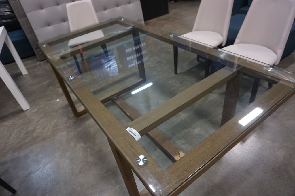 AS NEW MODERN GLASS AND WALNUT TABLE W/ 6 ROZZINI LEATHER CHAIRS, RETAIL $3699