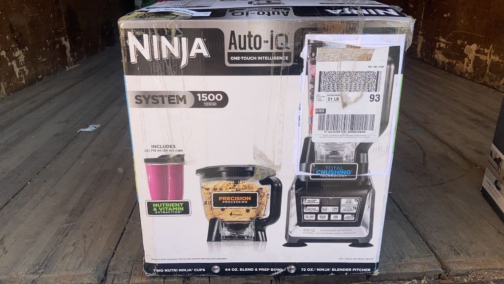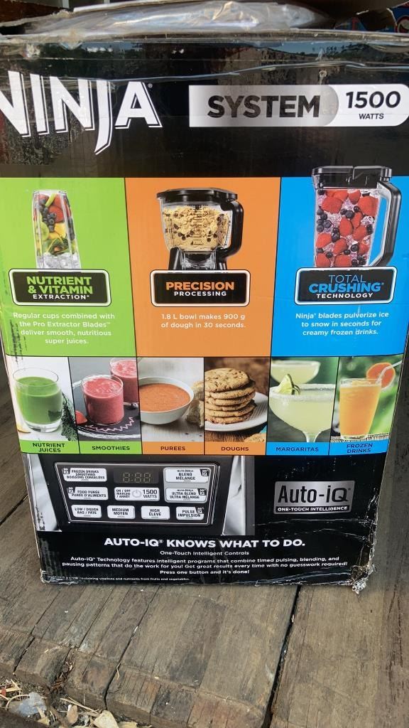 AS NEW NINJA AUTO IQ SYSTEM 1500W STAND BLENDER, FOOD PROCESSOR AND NUTRI CUPS, RETAIL $339