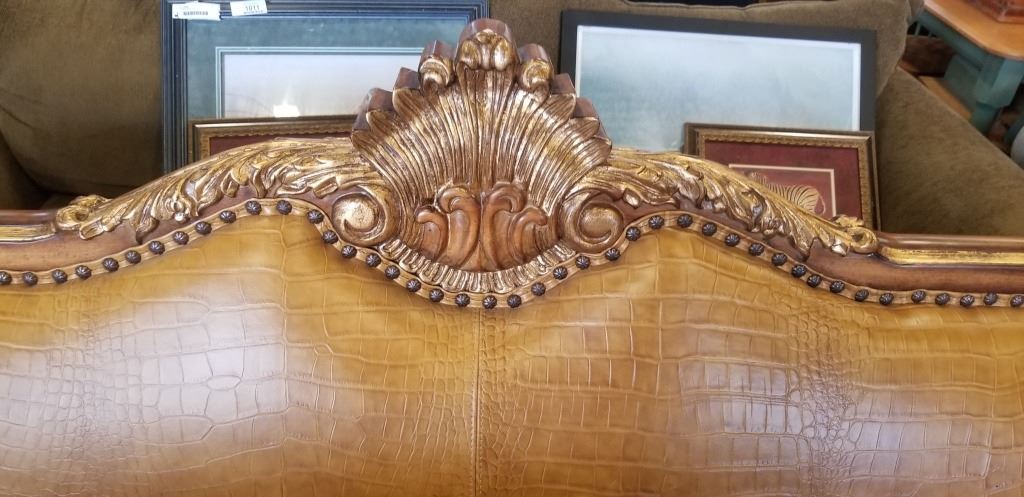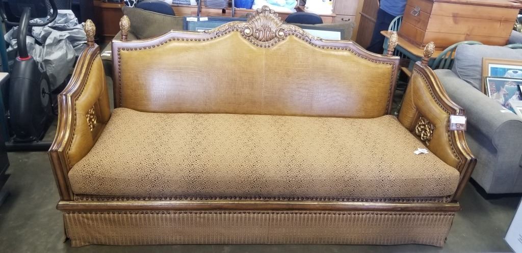AS NEW ORNATE AND HIGHLY DECORATED SOFA, RETAILS $4800, LEATHER BACKING, AS NEW CONDITION, 1 OF A KIND