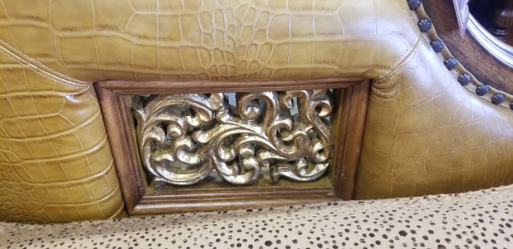 AS NEW ORNATE AND HIGHLY DECORATED SOFA, RETAILS $4800, LEATHER BACKING, AS NEW CONDITION, 1 OF A KI