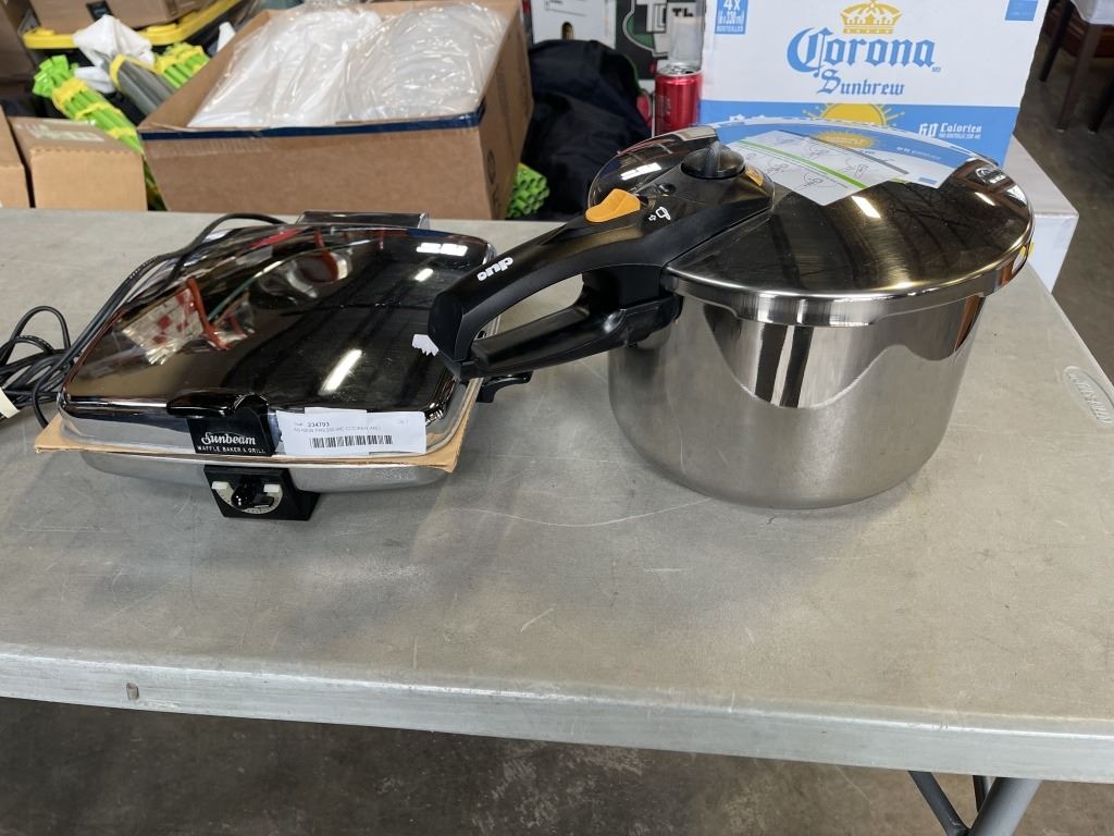 AS NEW PRESSURE COOKER AND SUNBEAM 4 SLICE WAFFLE IRON