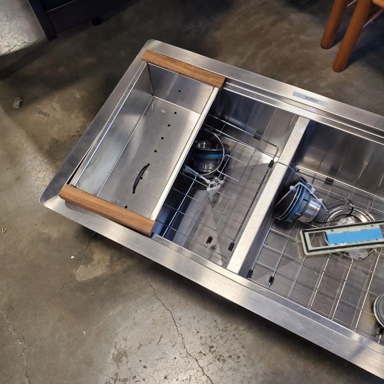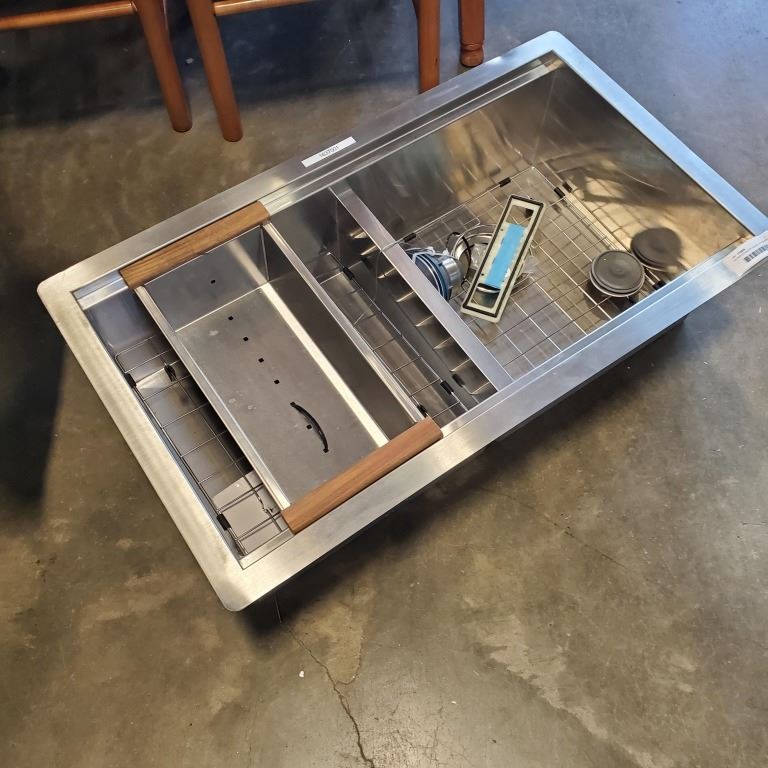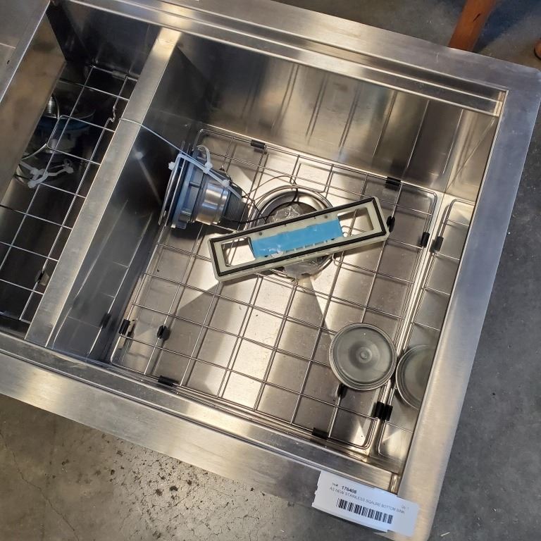 AS NEW STAINLESS SQAURE BOTTOM SINK WITH TRAY, GRATES, ACCESSORIES, 19x33 INCH