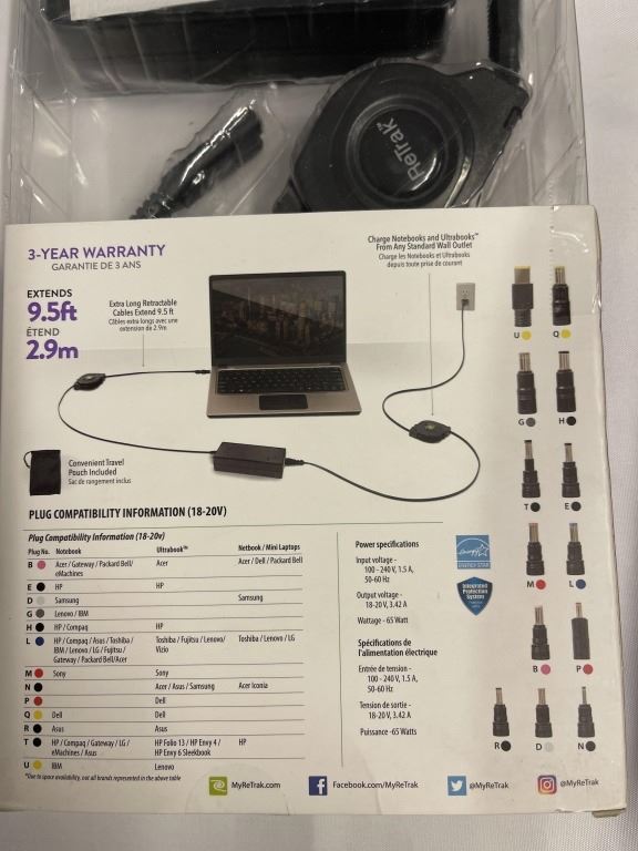 AS NEW UNIVERSAL RETRACTABLE LAPTOP CHARGERS AND 2 90 WATT UNIVERSAL LAPTOP CHARGERS TOTAL RETAIL VALUE $220