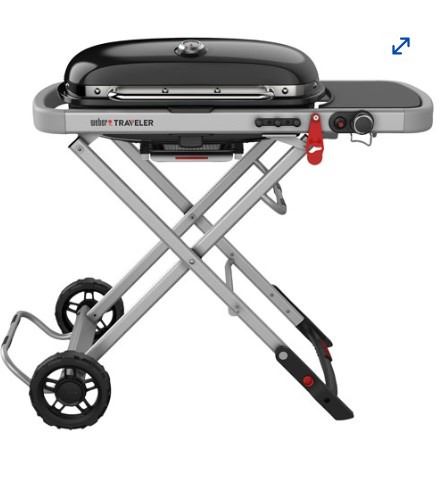 AS NEW WEBER TRAVELLER PORTABLE GAS GRILL - RETAIL $499