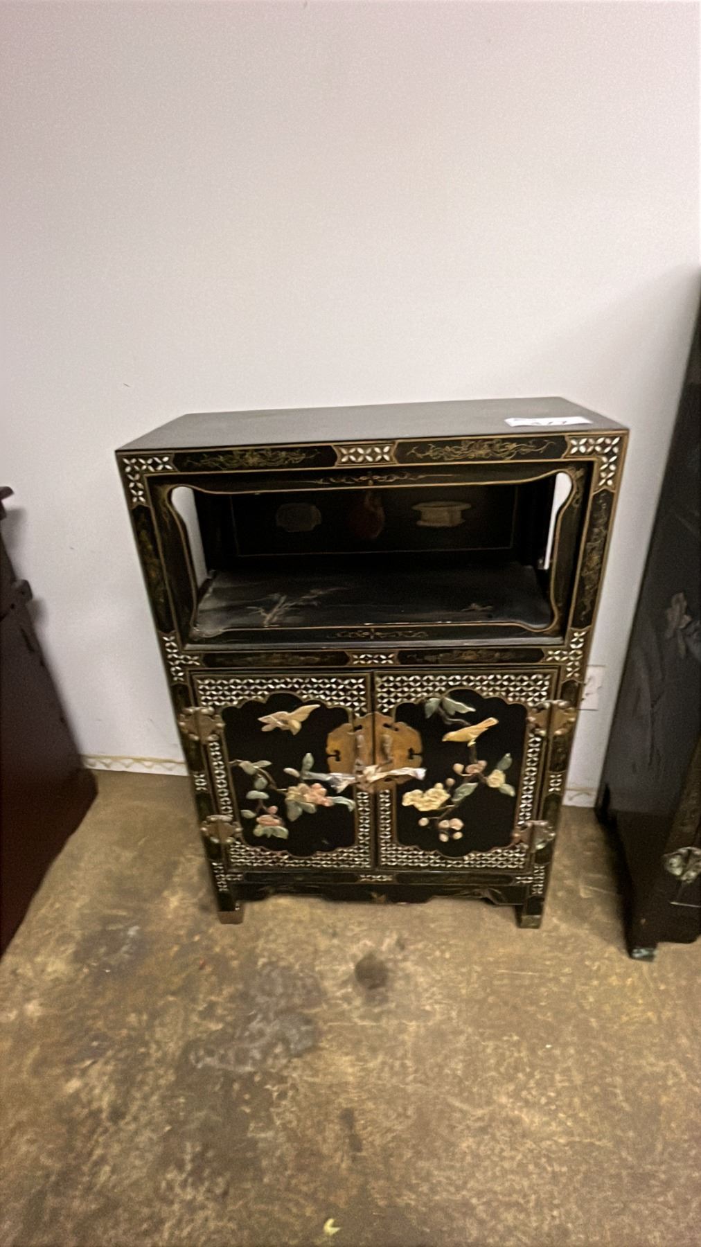 ASIAN STYLE PAINTED WOOD STORAGE CABINET WITH DISPLAY SHELF - APPROX. 37"T X 25"W X 12"D