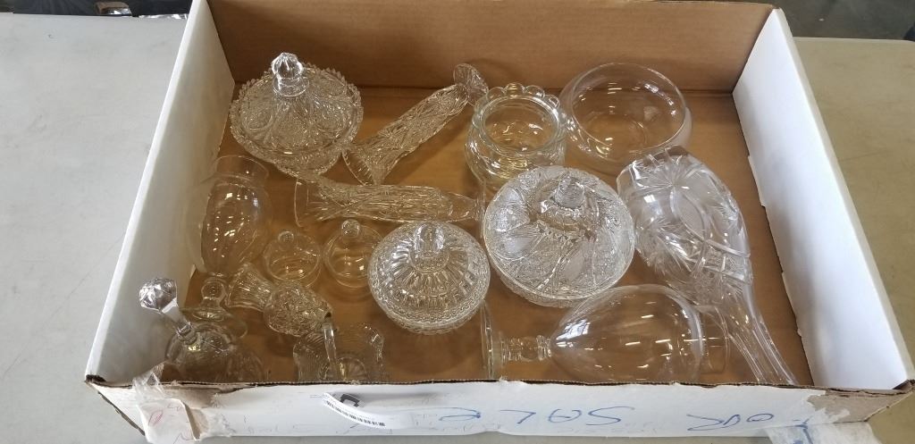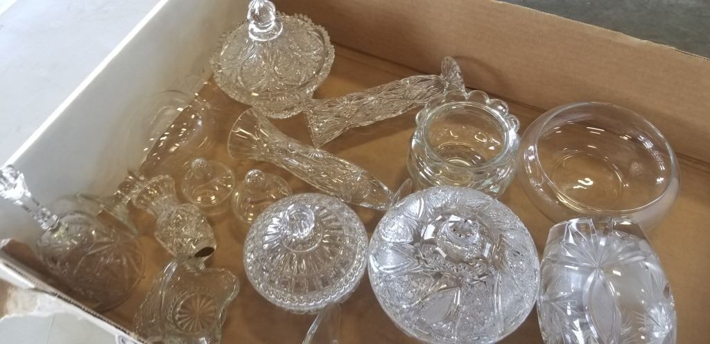 ASORTED GLASS DISHES, BOWLS, DECANTER, BELL AND LARGE JAR