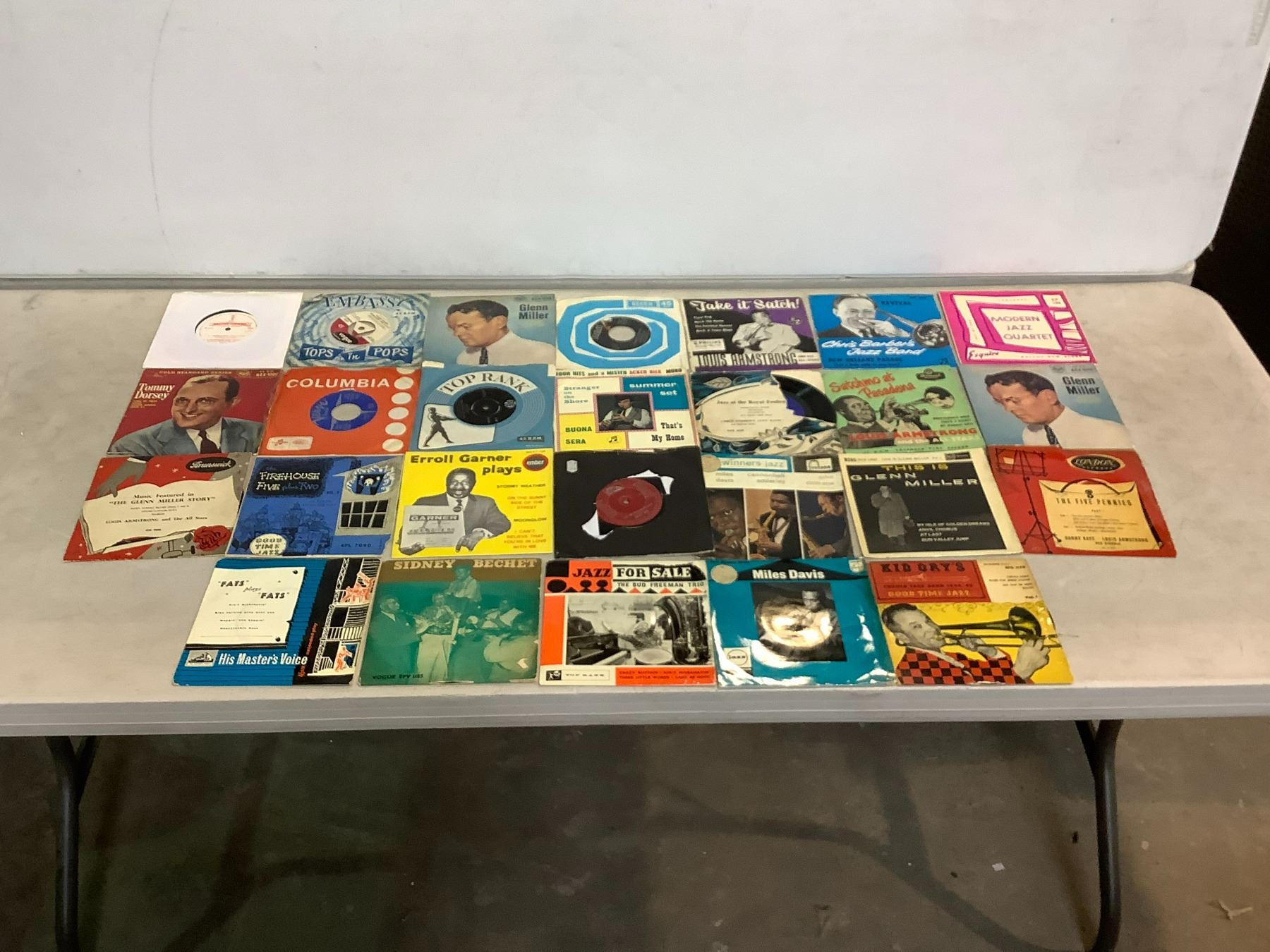 ASSORTED 45 RPM VINYL RECORDS ARTISTS INCLUDE LOUIS ARMSTRONG, GLENN MILLER, TOMMY DORSEY, THE FIVE PENNIES, CHRIS BARBER'S JAZZ BAND, MILES DAVIS, AND MORE, MANY ENGLISH PRESSED