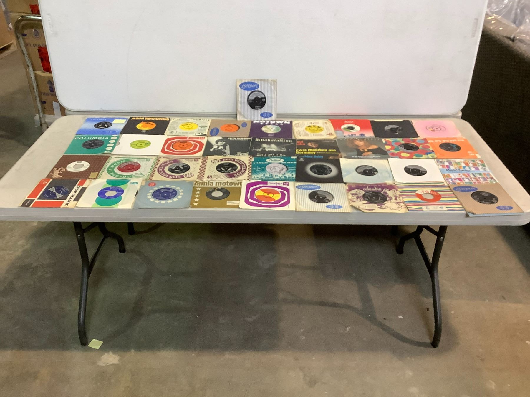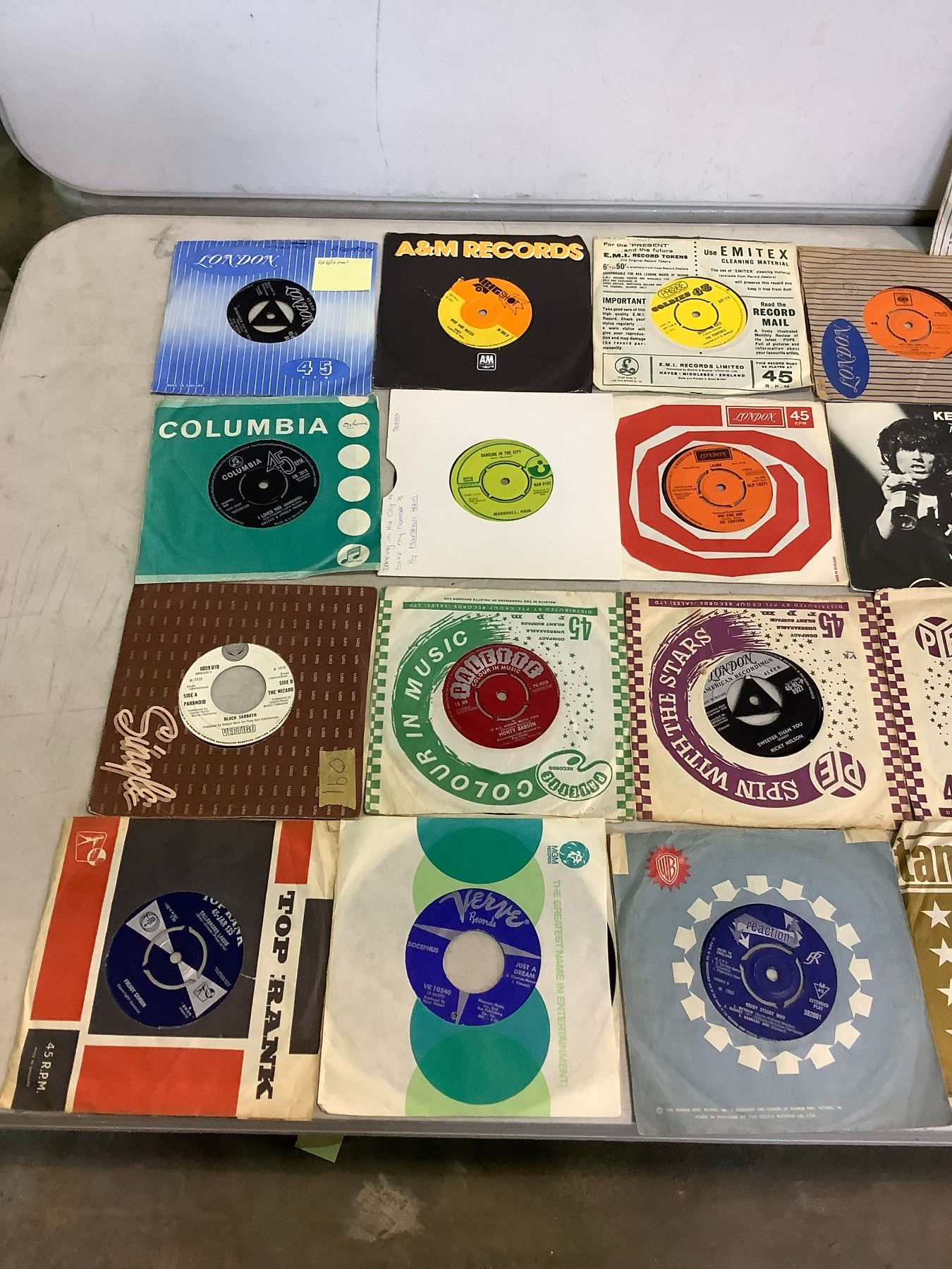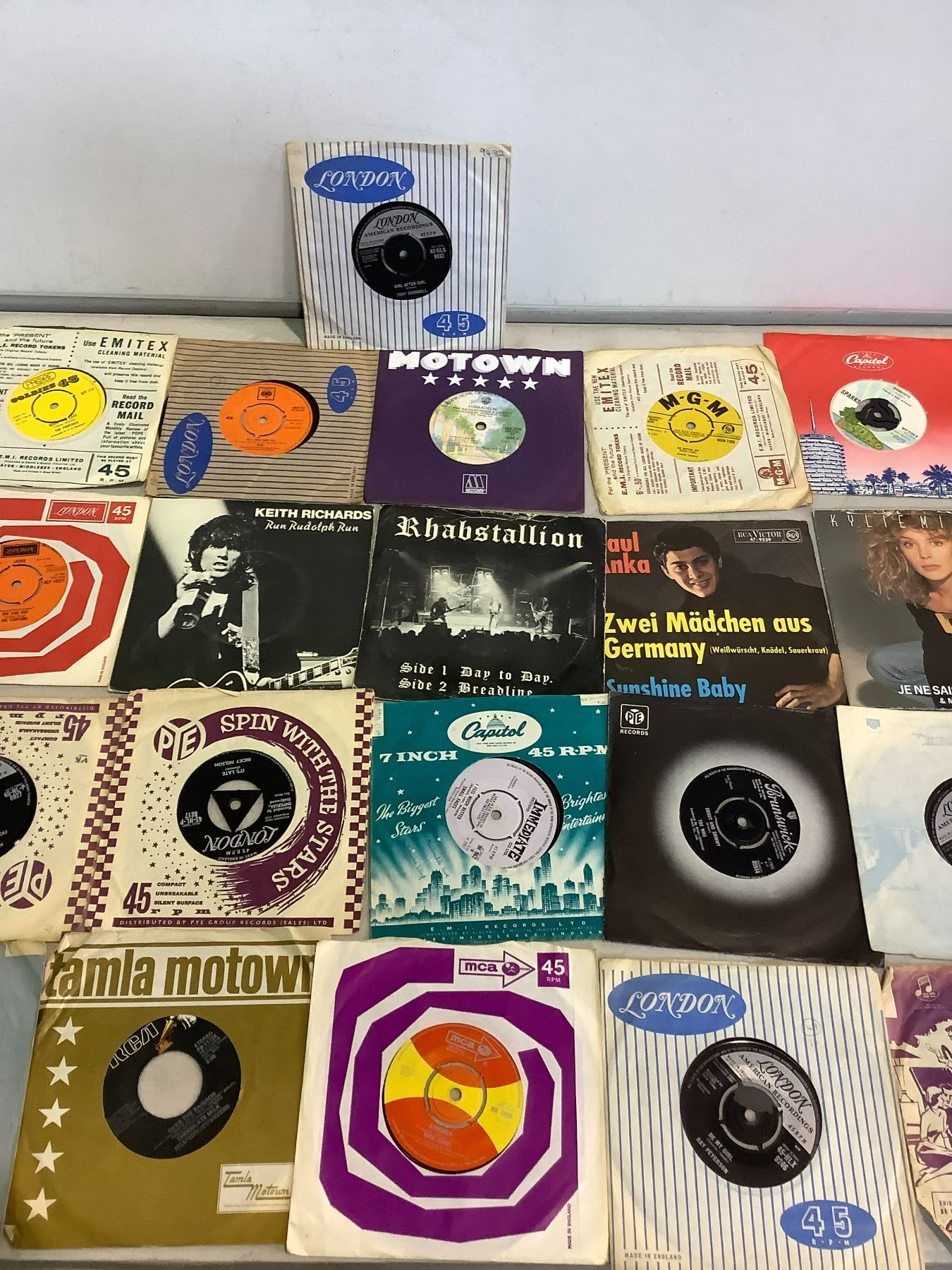 ASSORTED 45 RPM VINYL RECORDS ARTISTS INCLUDE THE PONYTAILS, DUANE EDDY, THE CHIFFONS, KEITH RICHARDS, PAUL ANKA, KYLIE MINOGUE, BLACK SABBATH, AND MORE, MANY ENGLISH PRESSED