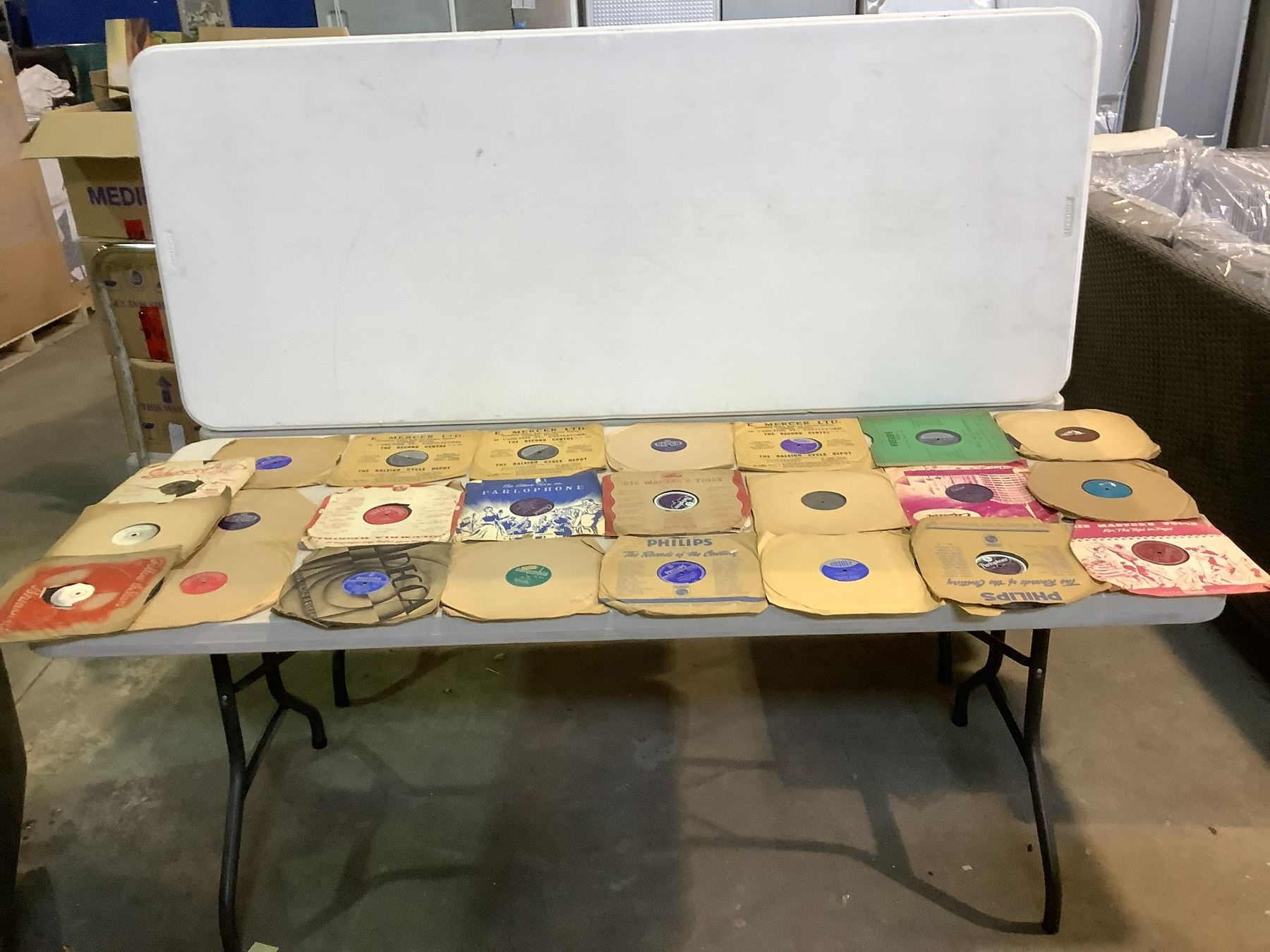 ASSORTED 78 RPM VINYL RECORDS ARTISTS INCLUDE JACKIE DENNIS, PAT BOONE, TEX RITTER, BING CROSBY AND FRANK SINATRA, EVE BOSWELL, JIMMY YOUNG, AND MORE, MANY ENGLISH PRESSED