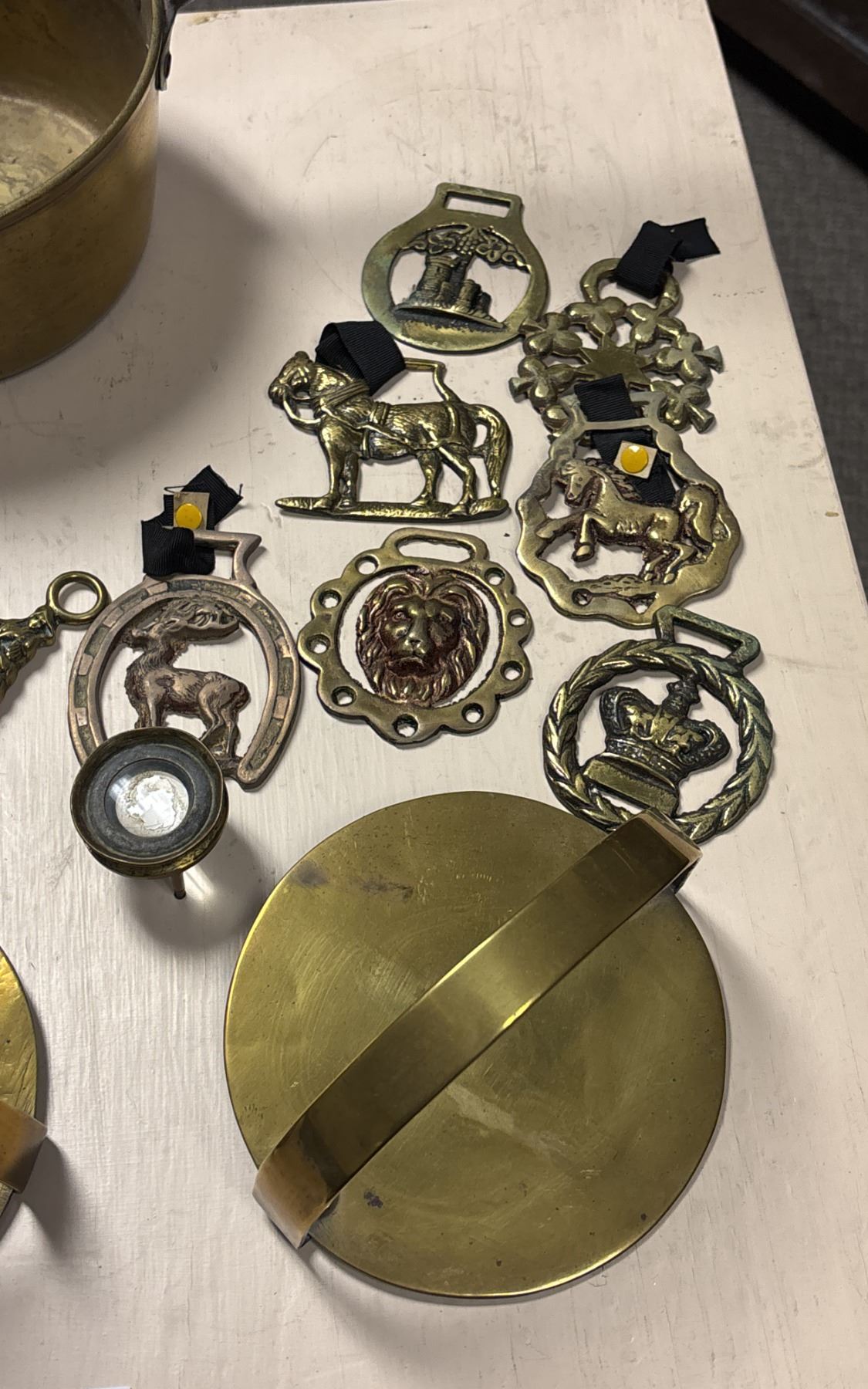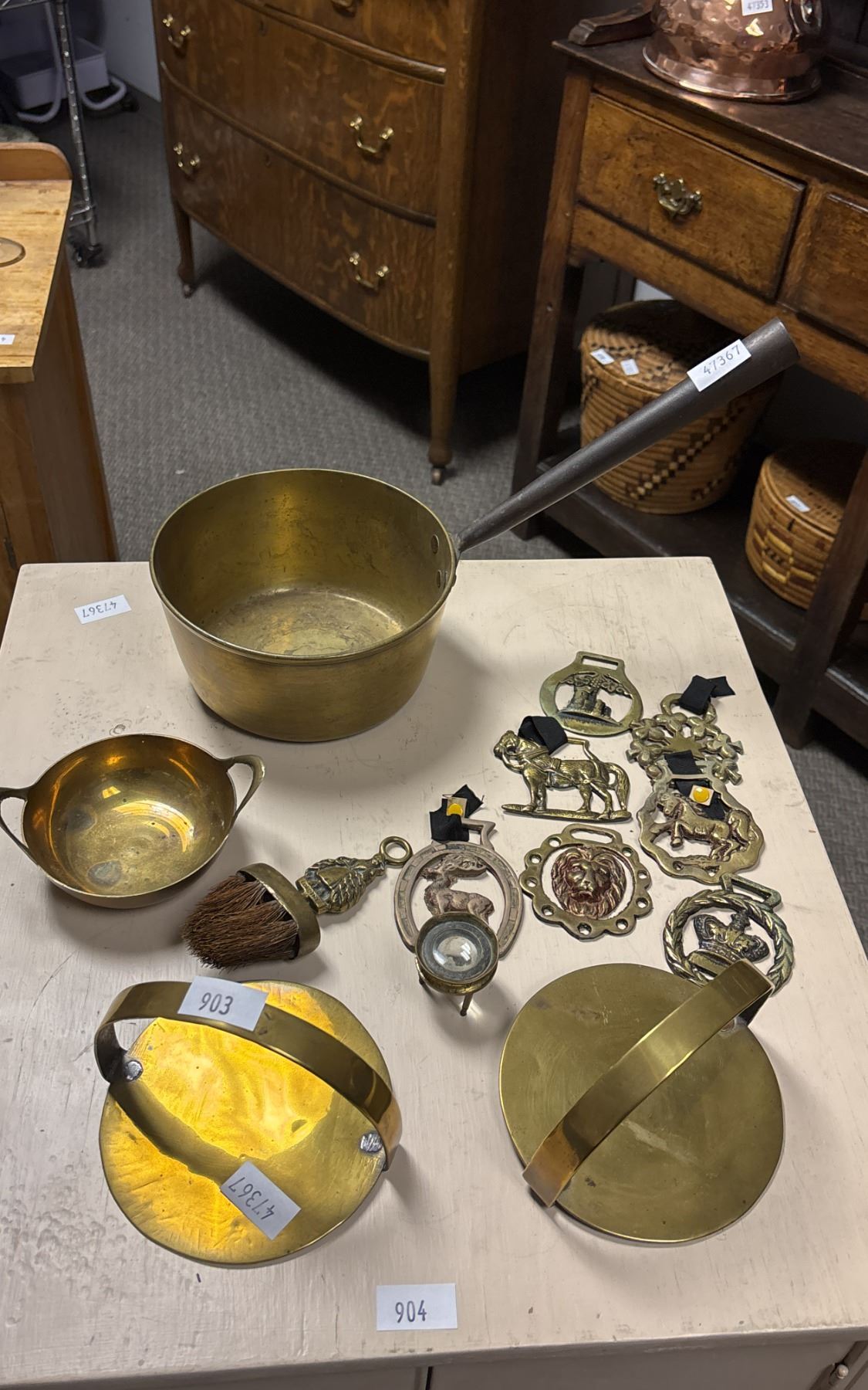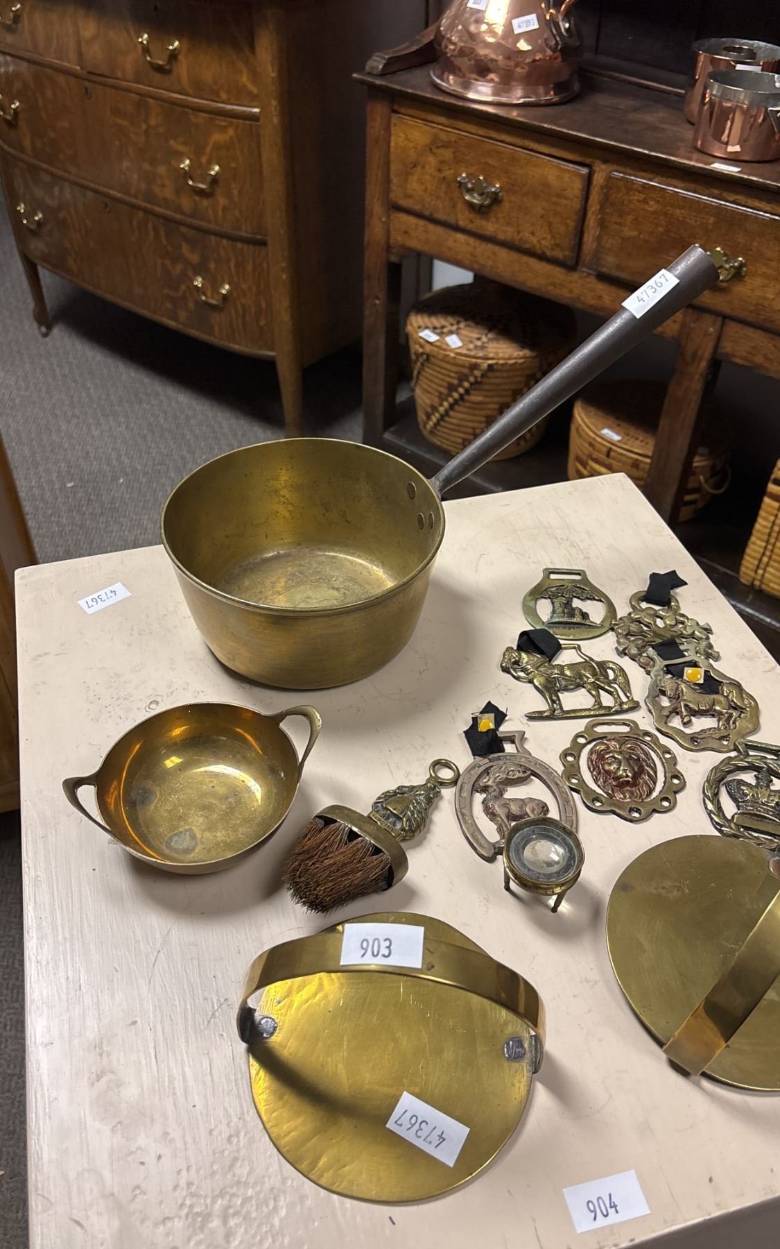 ASSORTED ANTIQUE BRASS ITEMS INCLUDING; POT, BRUSH, ORNAMENTS & MORE