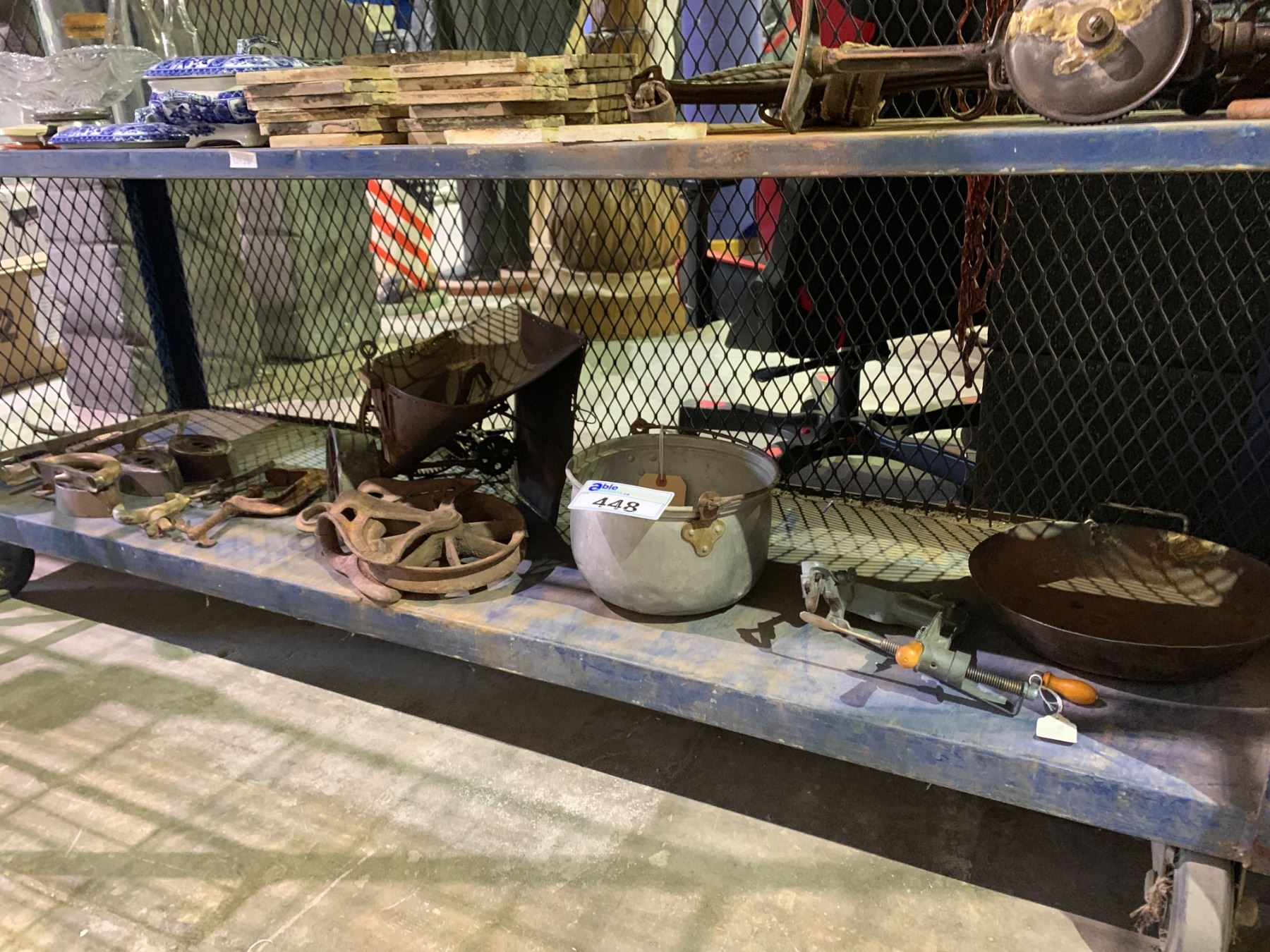ASSORTED ANTIQUES INCLUDING; C-CLAMP, PAN, ICE SKATE BLADES & MORE