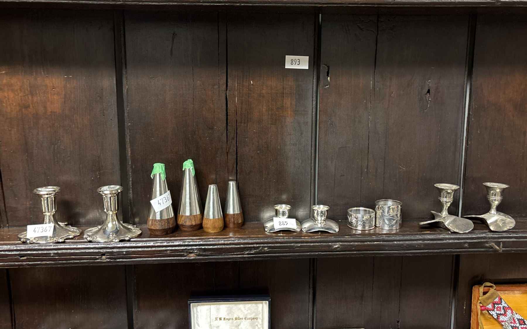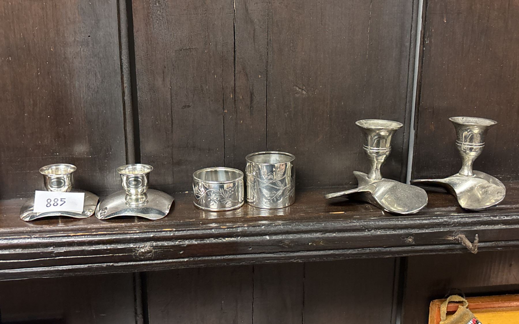 ASSORTED ANTIQUES INCLUDING; CANDLE HOLDERS, NAPKIN RINGS & SALT & PEPPER SHAKERS