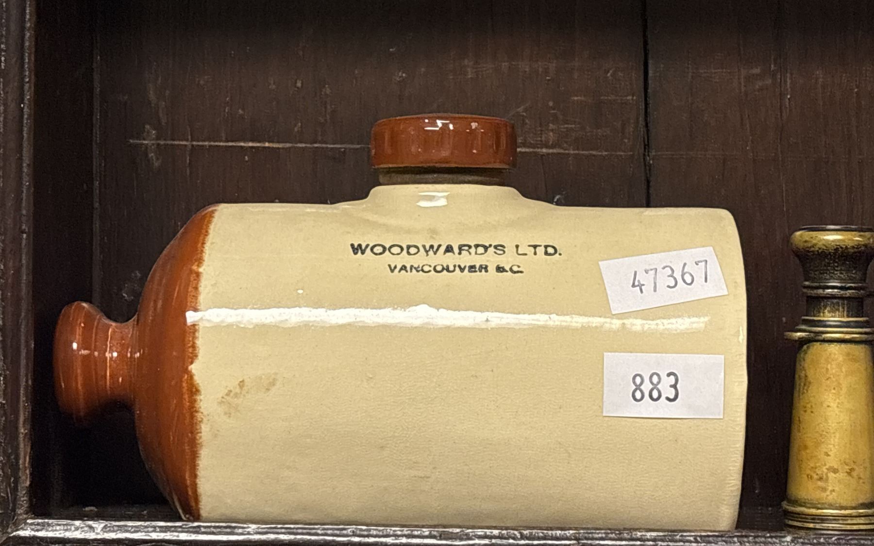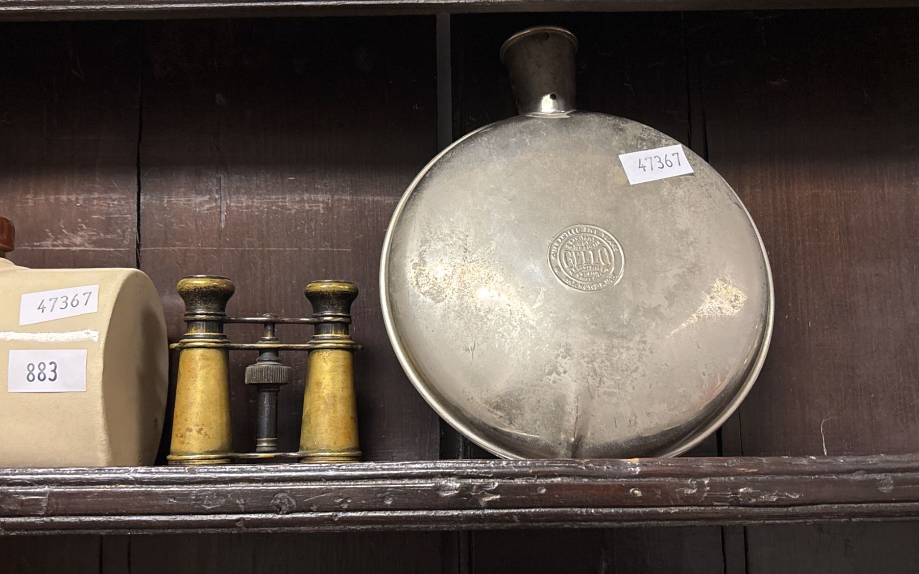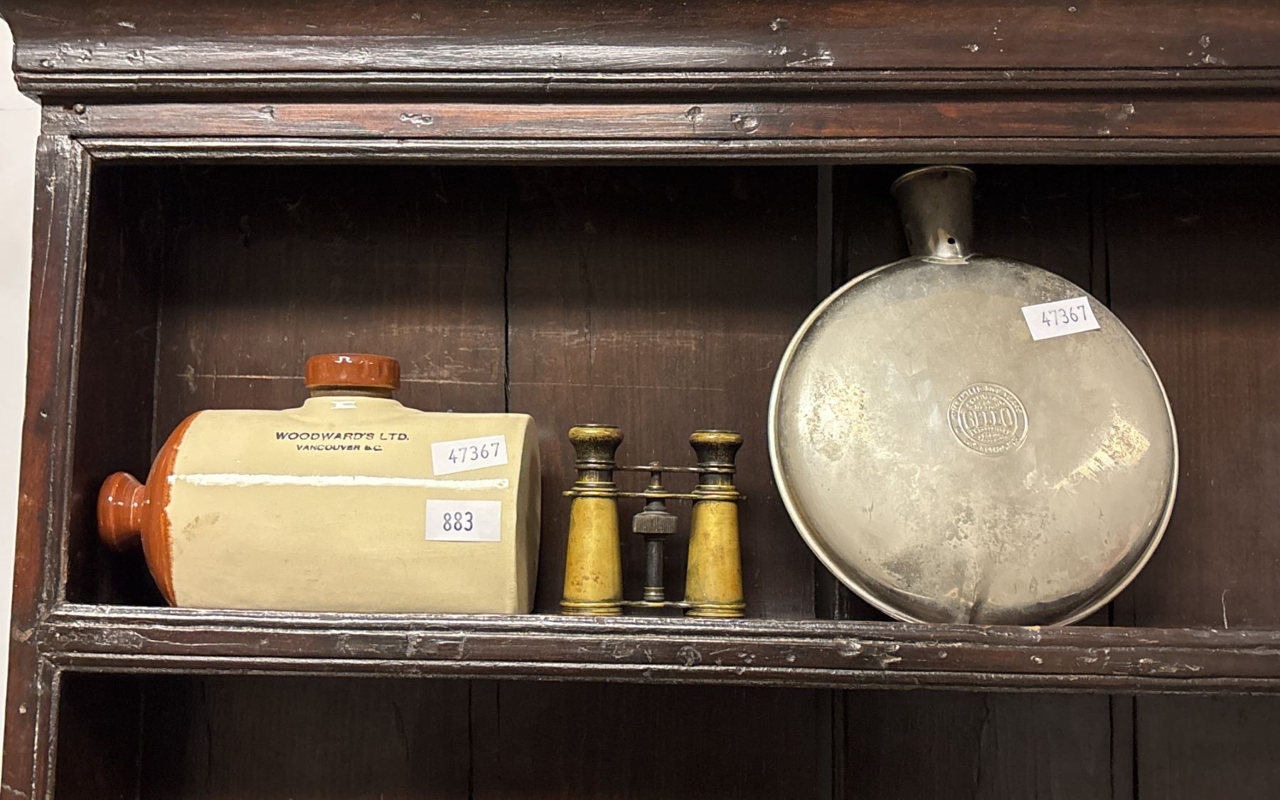 ASSORTED ANTIQUES INCLUDING; HOT WATER BOTTLE, BRASS BINOCULARS & GREEN & CO POTTERY JUG