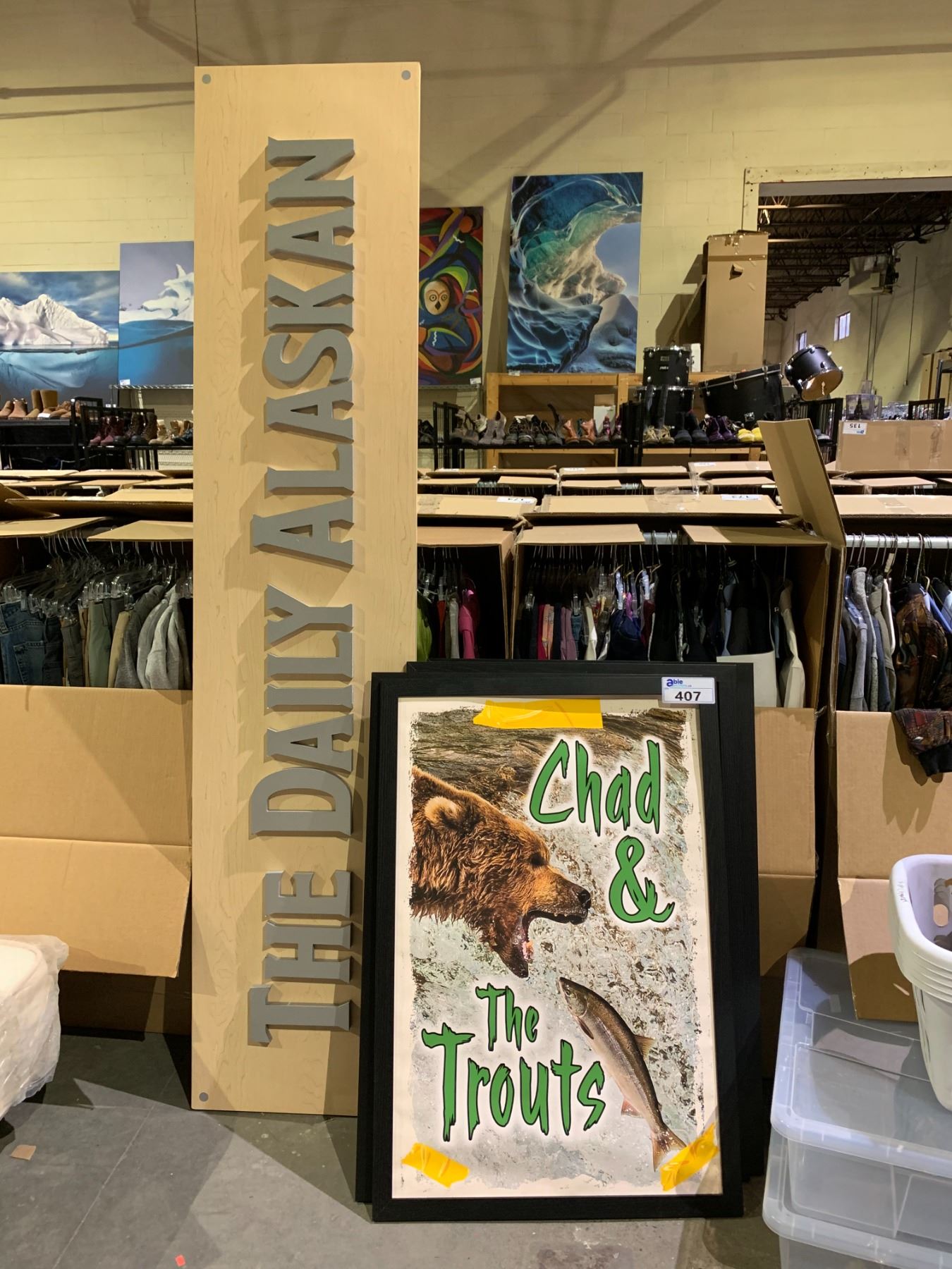 ASSORTED ART INCLUDING; FRAMED CHAD & THE TROUTS PRINTS, THE DAILY ALASKAN SIGN & MORE