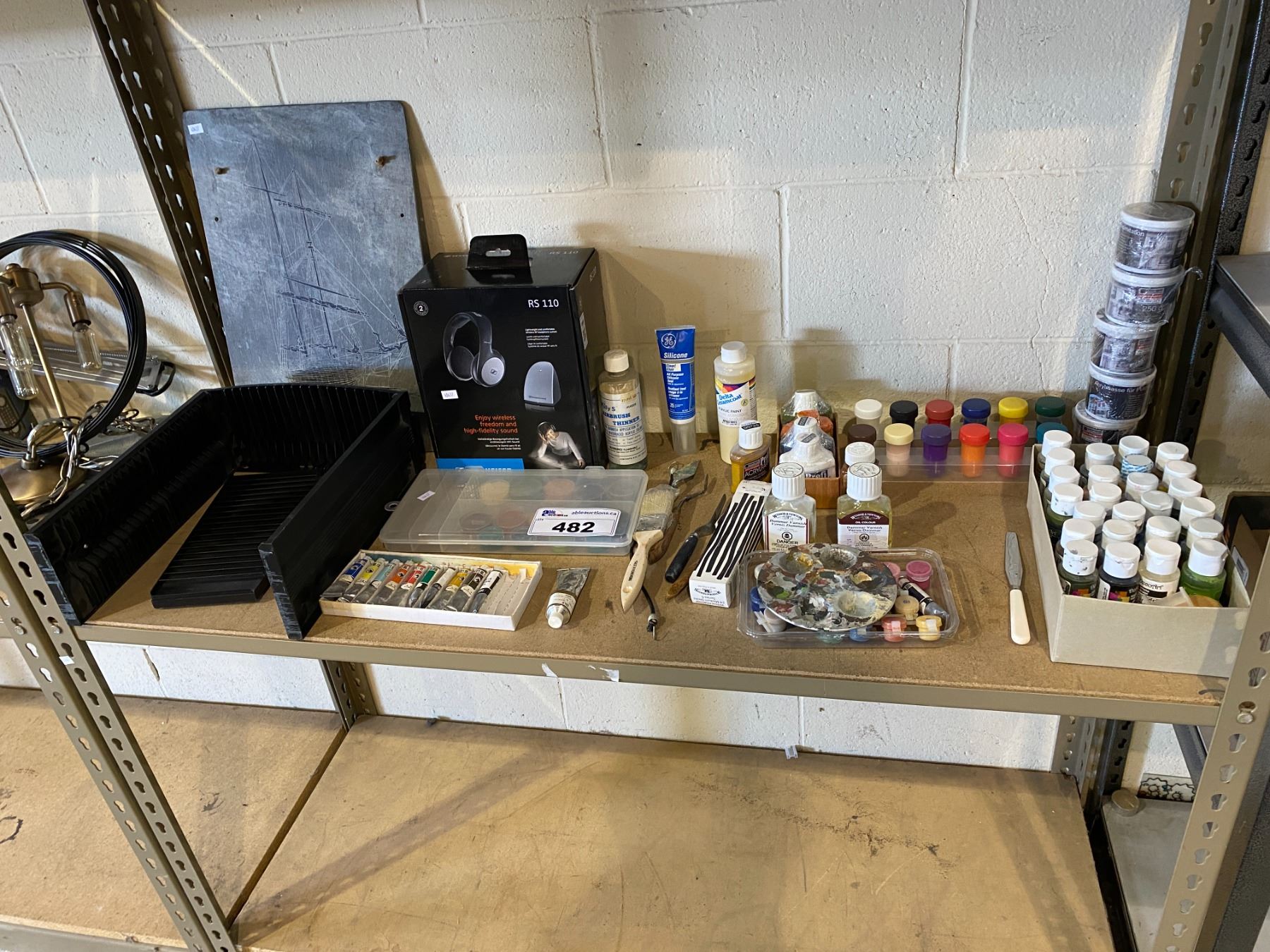 ASSORTED ART SUPPLIES, PAINT, HEADPHONES, BRUSHES, & MORE