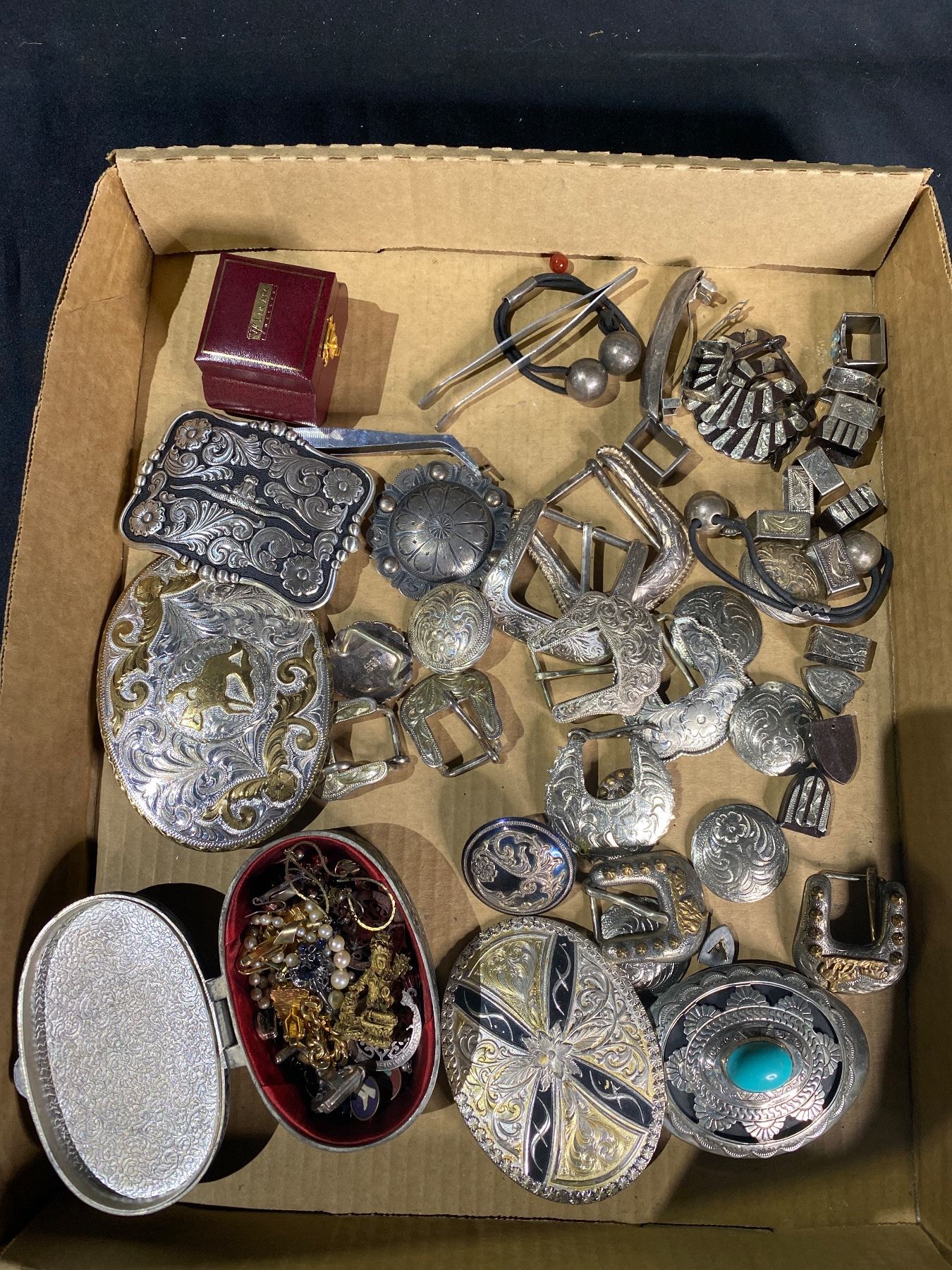 ASSORTED BELT BUCKLES AND JEWELRY (SOME STERLING SILVER)