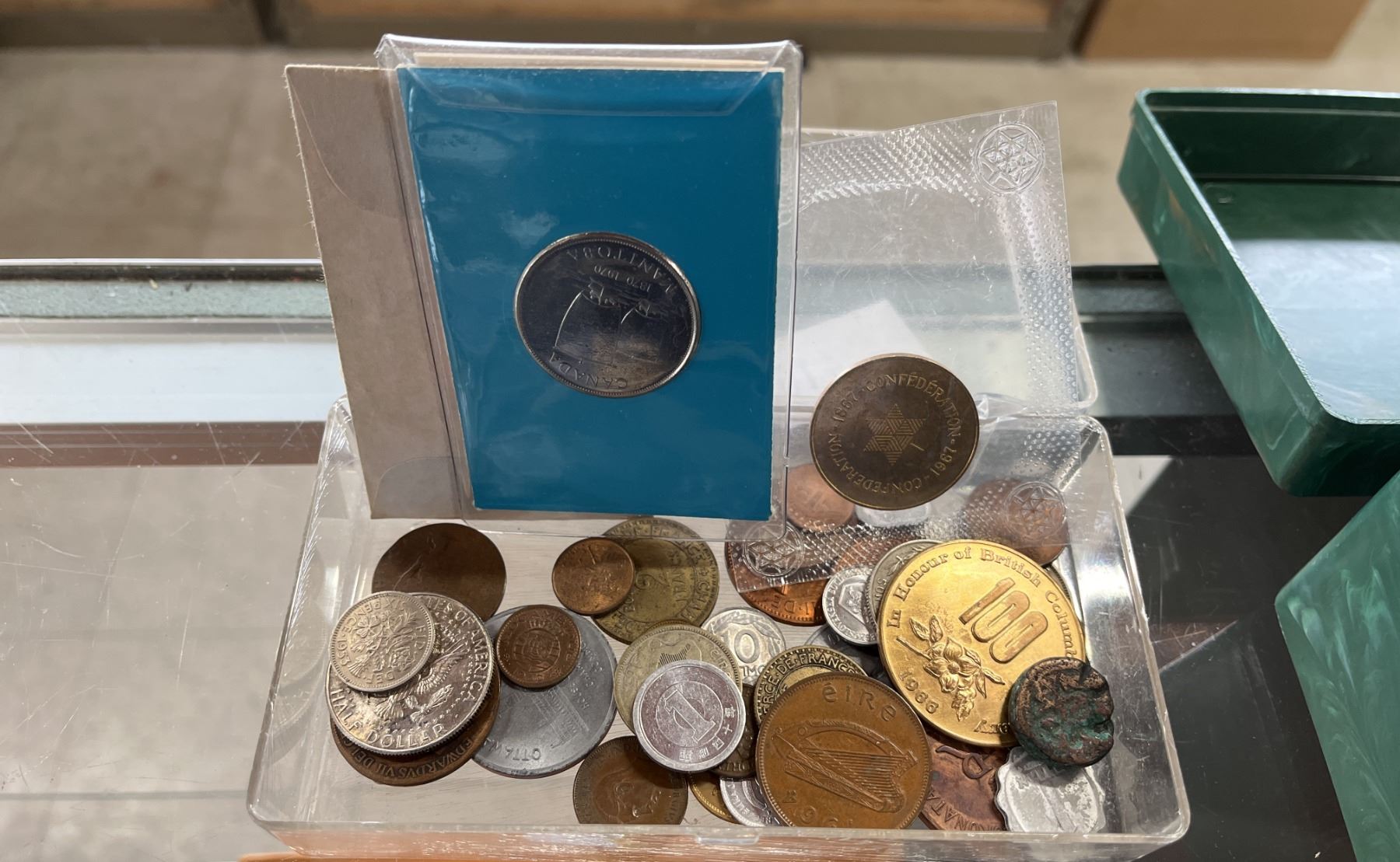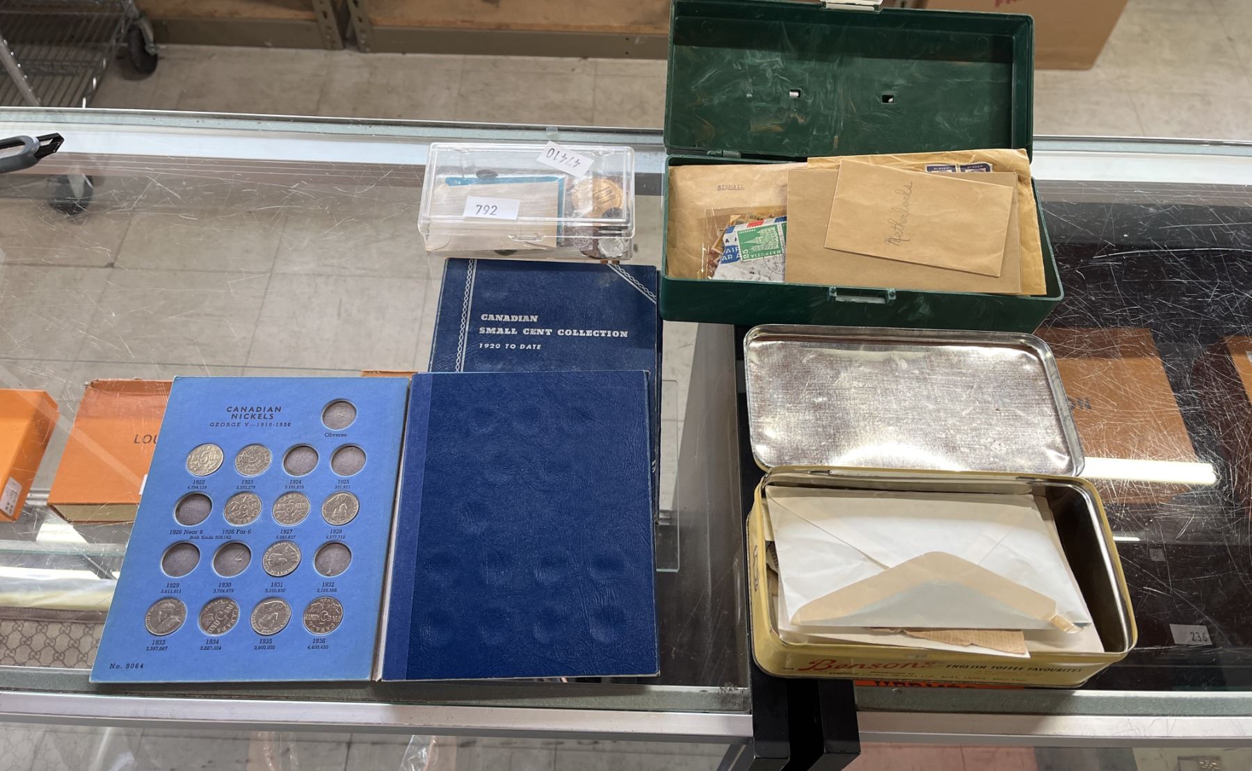 ASSORTED CANADIAN COINS & 2 TINS OF STAMPS