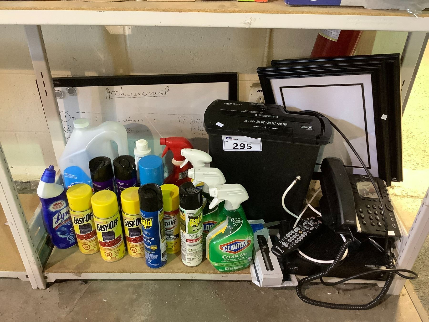 ASSORTED CLEANING PRODUCTS+BUG KILLERS, PAPER SHREDDER, POLYCOM PHONE, PICTURE FRAMES, & MORE