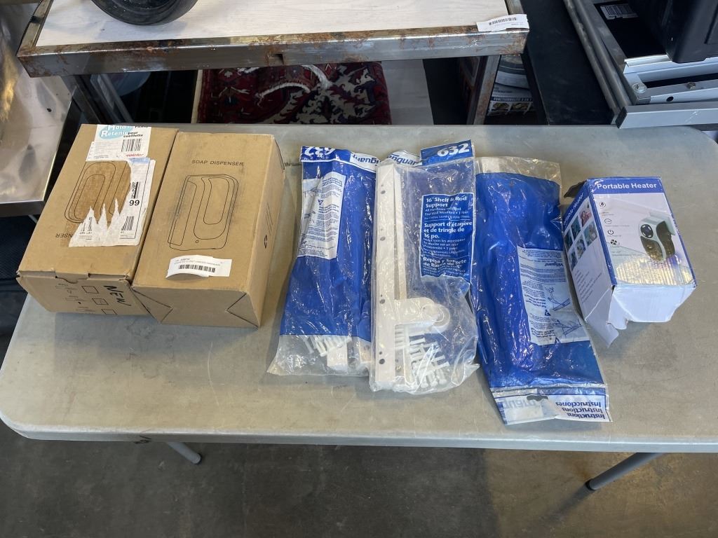ASSORTED CLOSET HANGER HARDWARE, PORTABLE HEATER AND SOAP DISPENSERS ETC