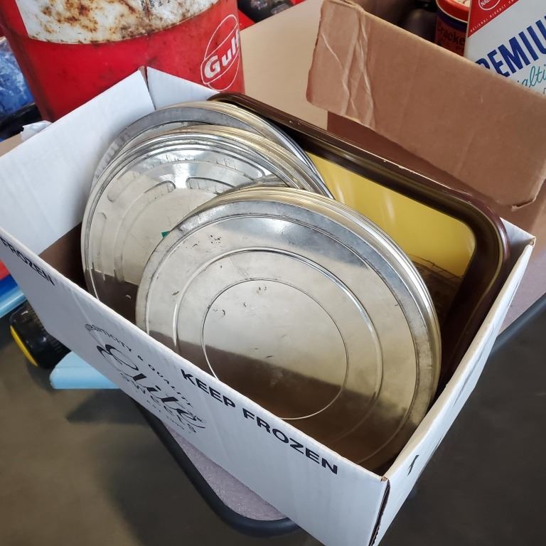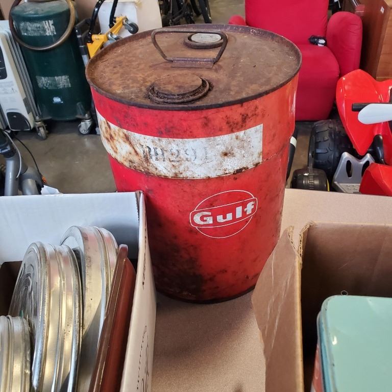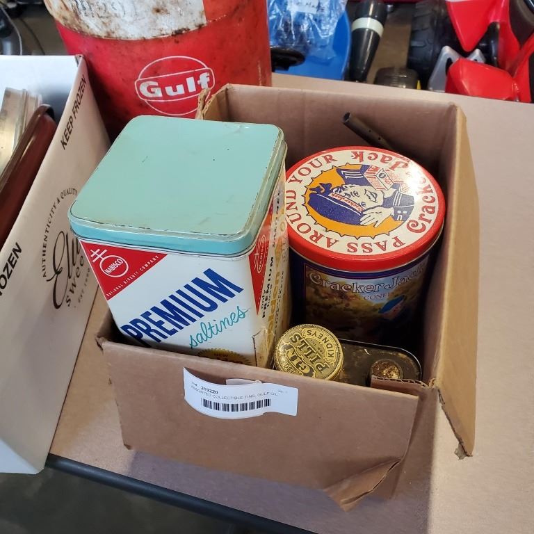 ASSORTED COLLECTIBLE TINS, GULF OIL CAN AND MOVIE REEL CASES