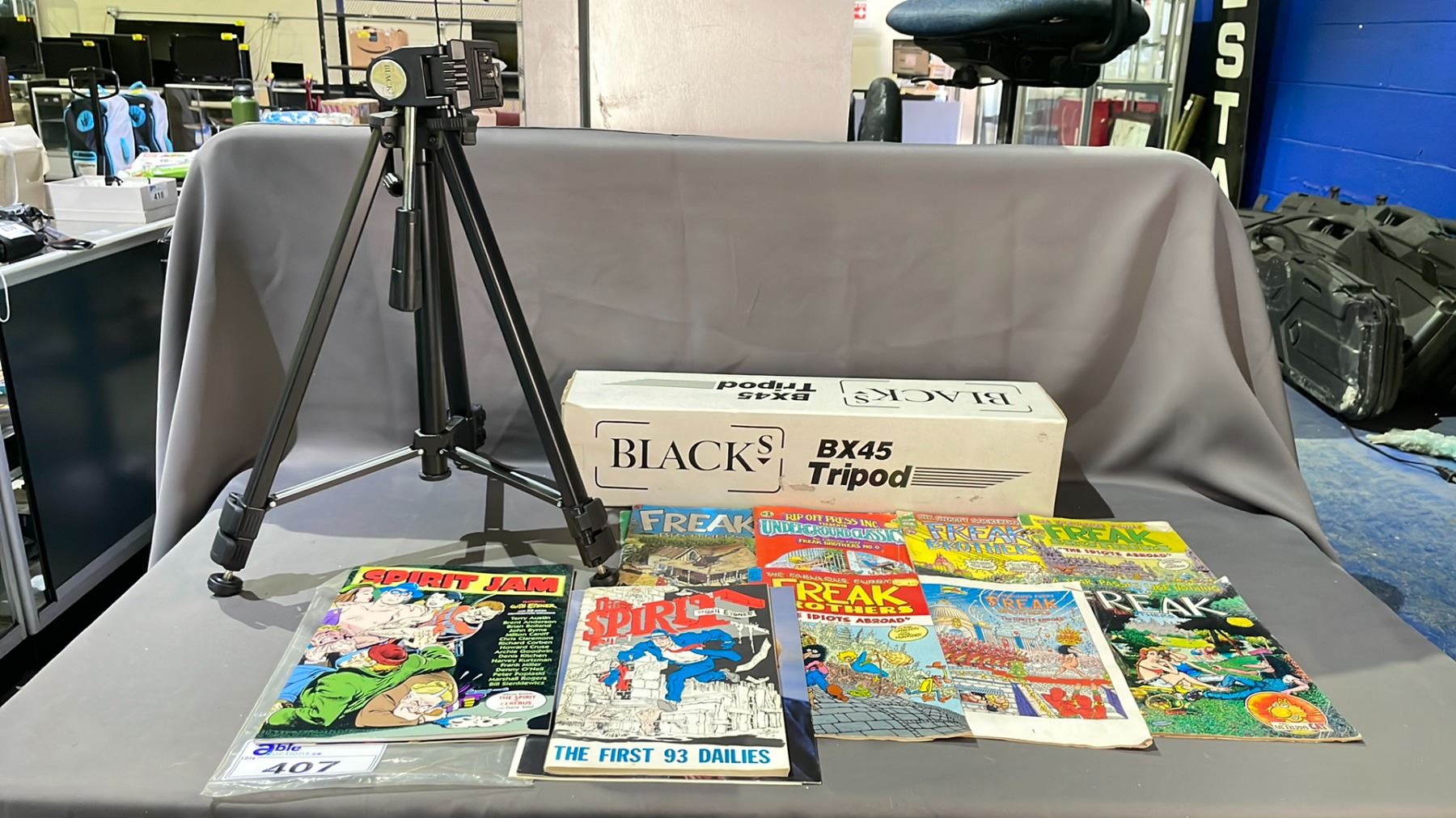 ASSORTED COMIC BOOKS & BLACK BX45 TRIPOD