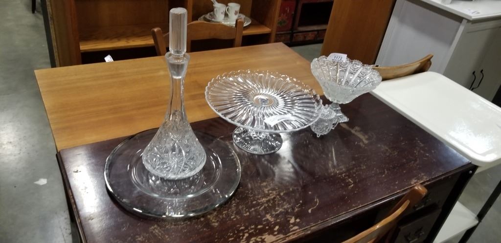 ASSORTED CUT CRYSTAL AND PINWHEEL ITEMS, INCLUDING LARGE DECANTER