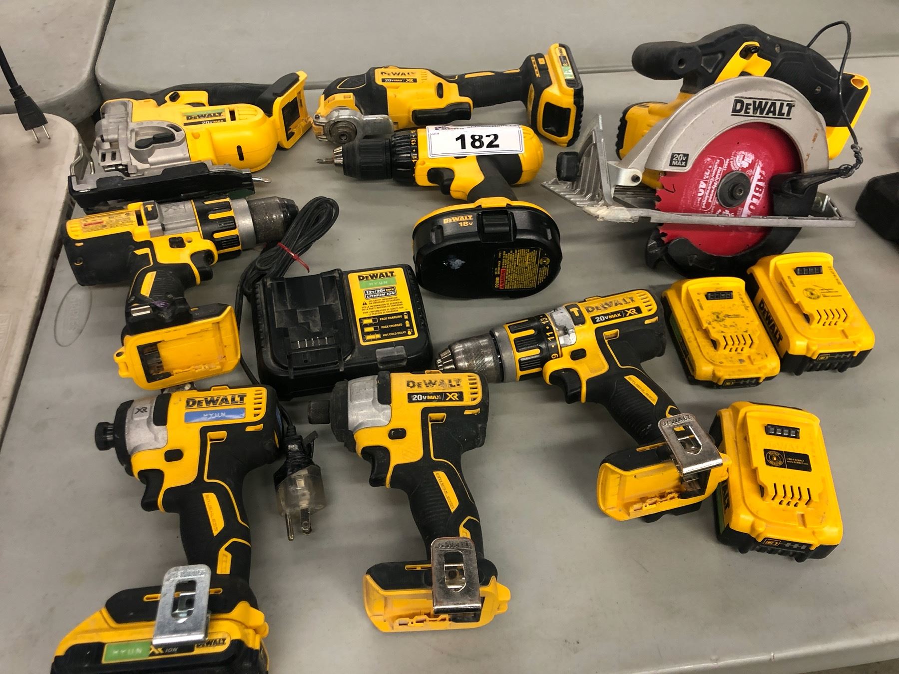 ASSORTED DEWALT TOOLS INC. DRILLS, JIG SAW, CIRCULAR SAW, CHARGERS AND BATTERIES