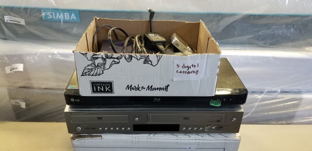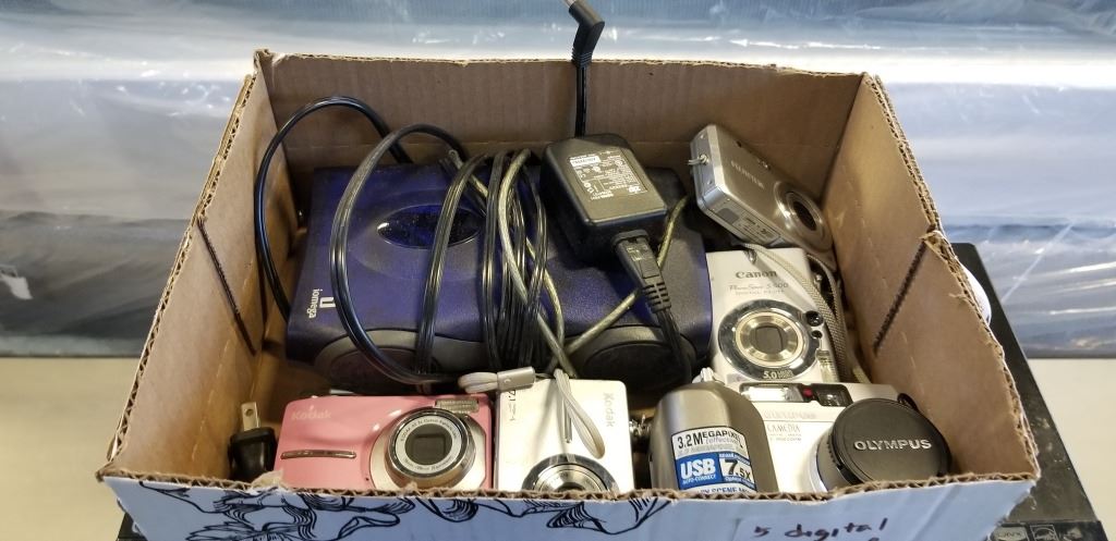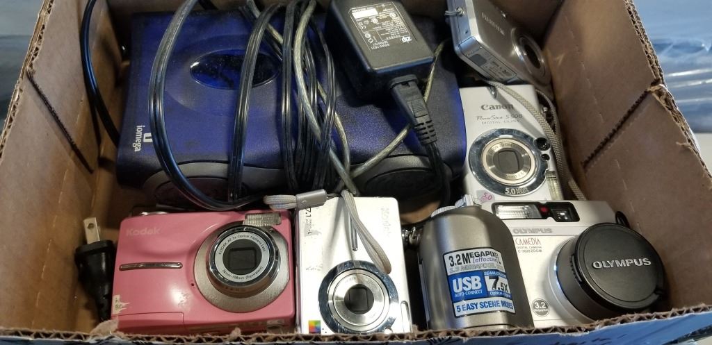 ASSORTED DIGITAL CAMERAS, DISK DRIVE, DVD/ VHS COMBO AND DVD PLAYER