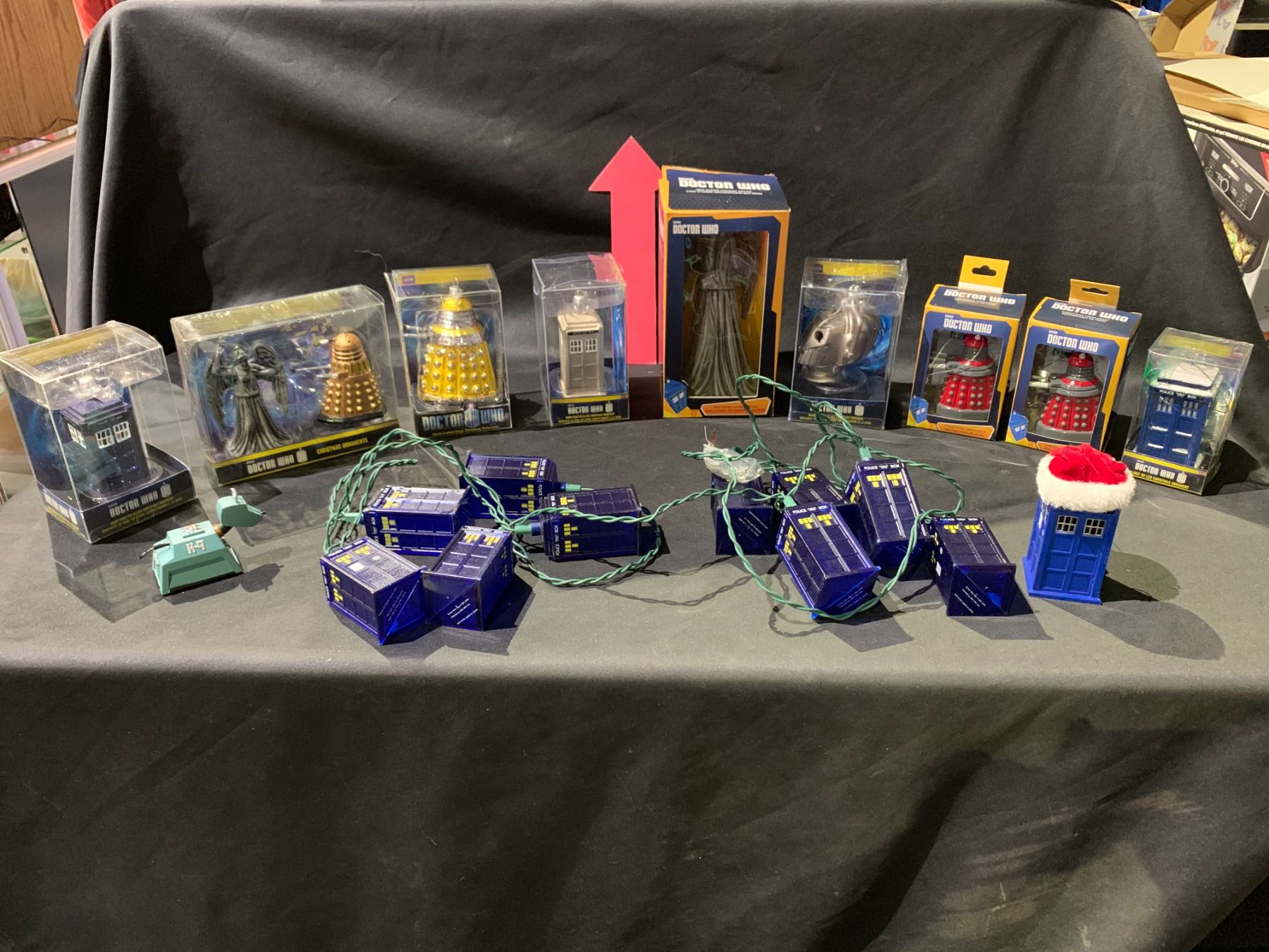 ASSORTED DOCTOR WHO CHRISTMAS ORNAMENTS INCLUDING; TREE TOPPER, TARDIS STRING LIGHTS, ASSORTED HAND PAINTED GLASS ORNAMENTS & MORE