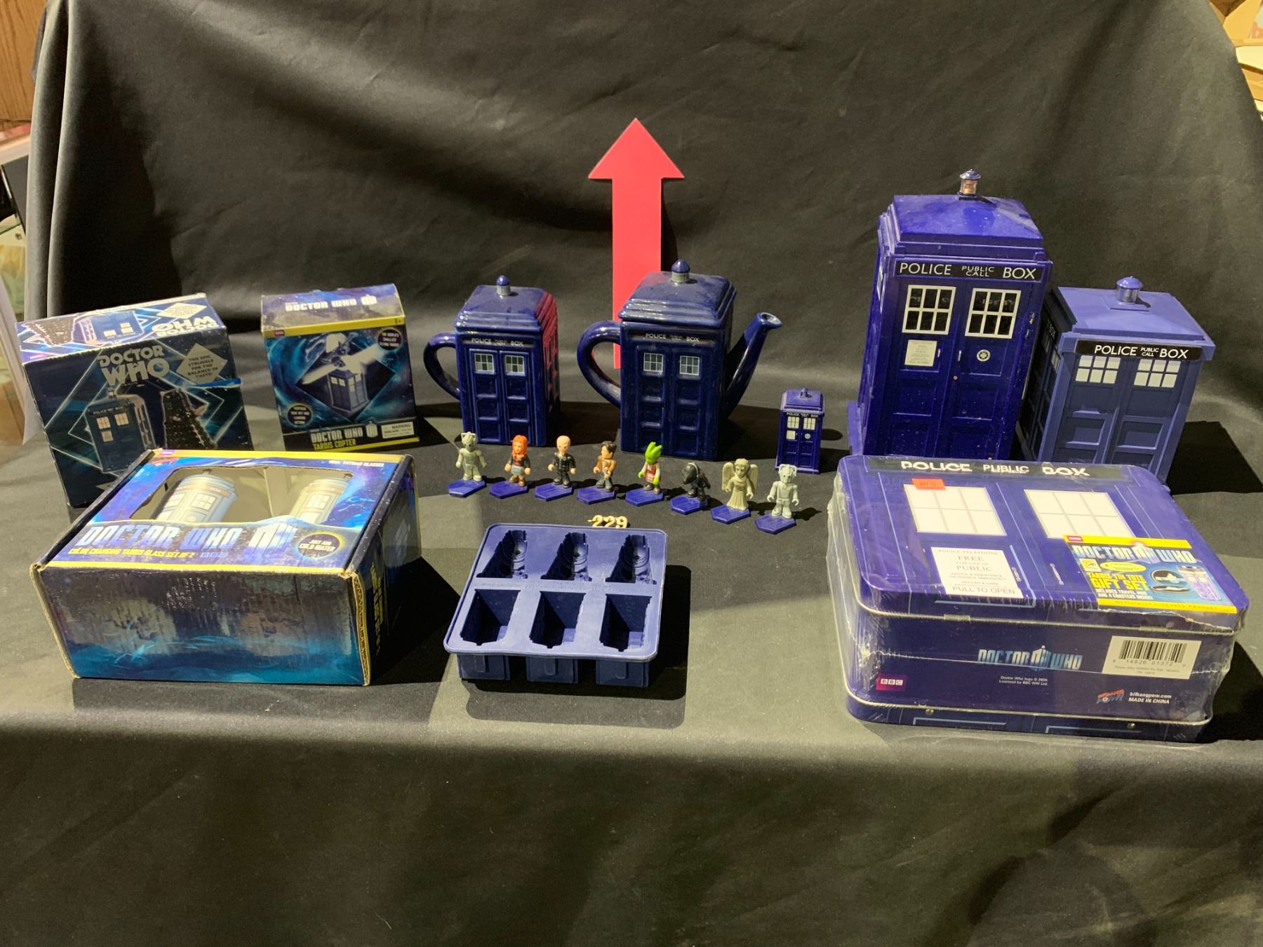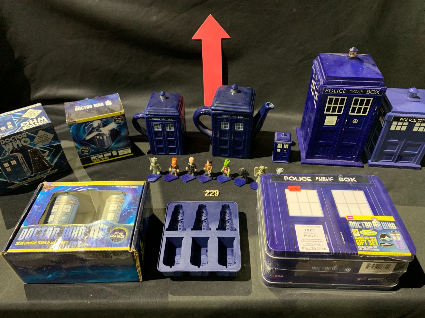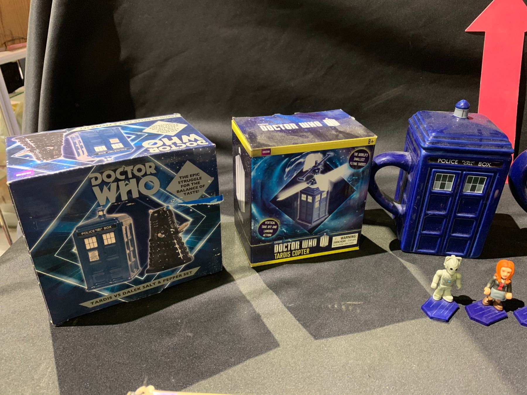 ASSORTED DOCTOR WHO COLLECTIBLES INCLUDING; TARDIS VS DALEK SALT & PEPPER SET, SEALED TARDIS TIN TOTE, COLOUR CHANGING TARDIS GLASS SET OF 2 & MORE