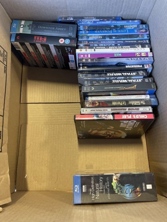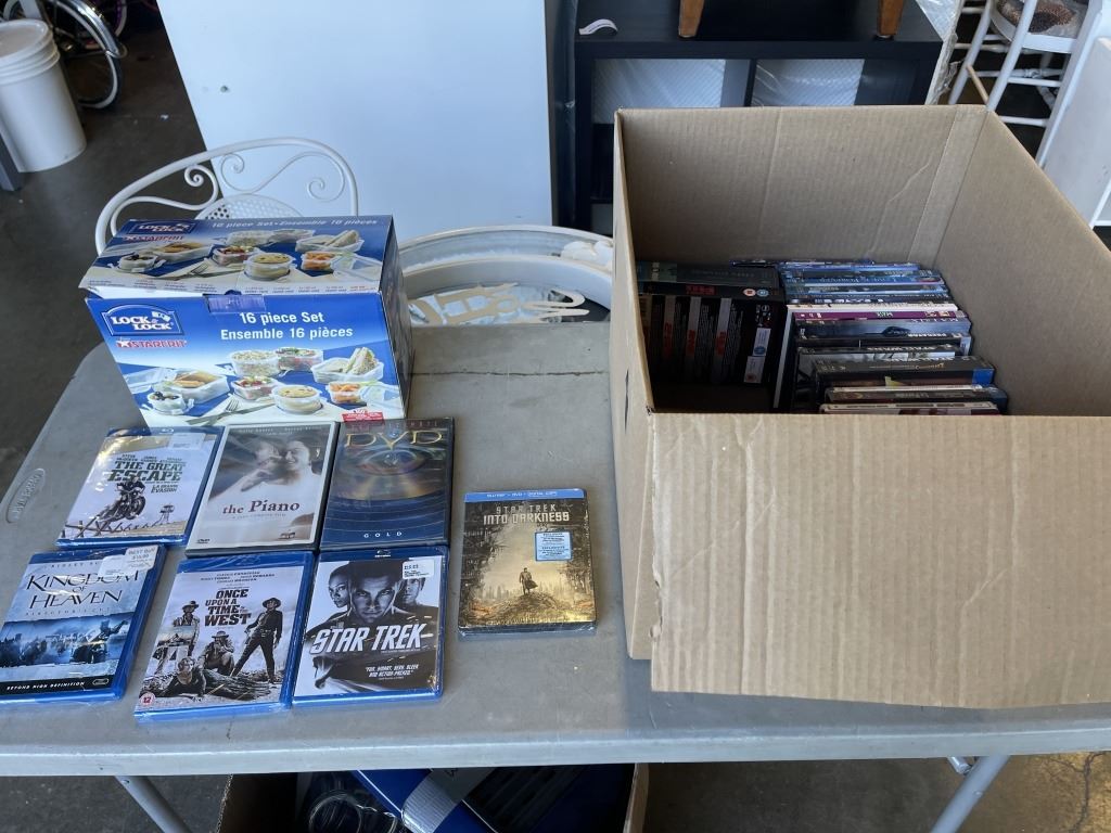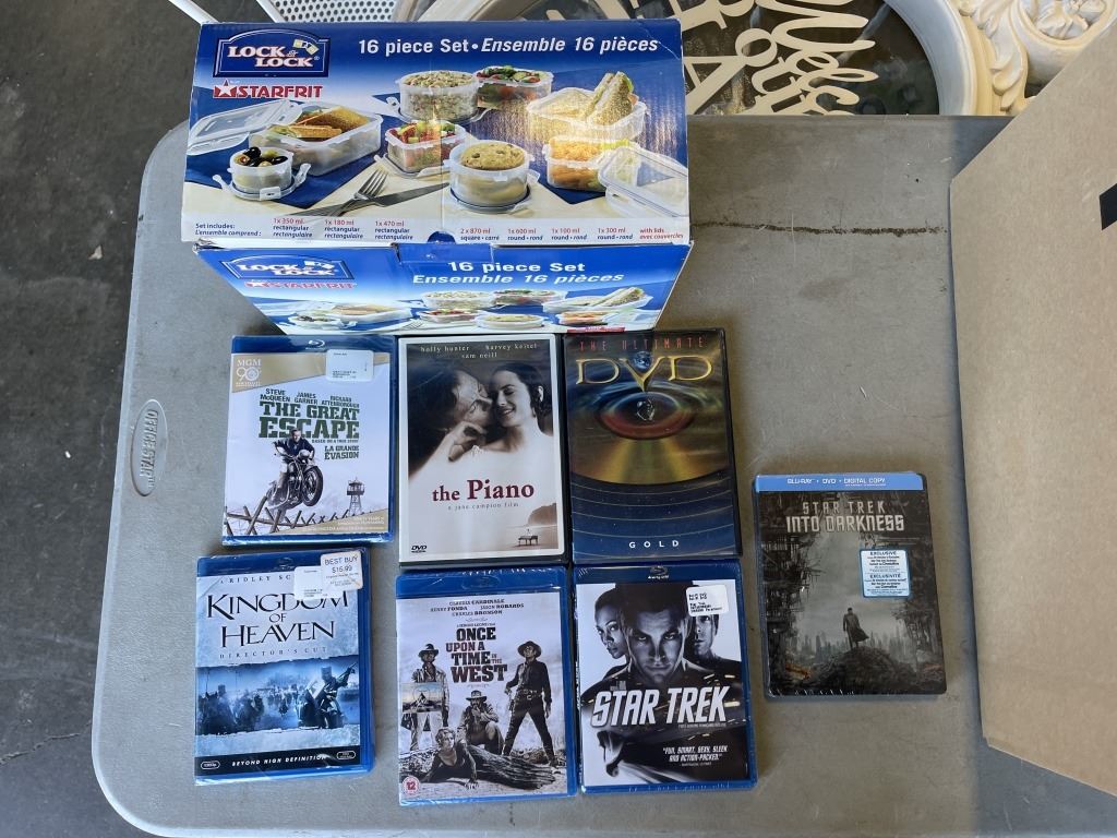 ASSORTED DVDS AND BLU RAYS, MOSTLY NEW SEALED, AND CONTAINER SET