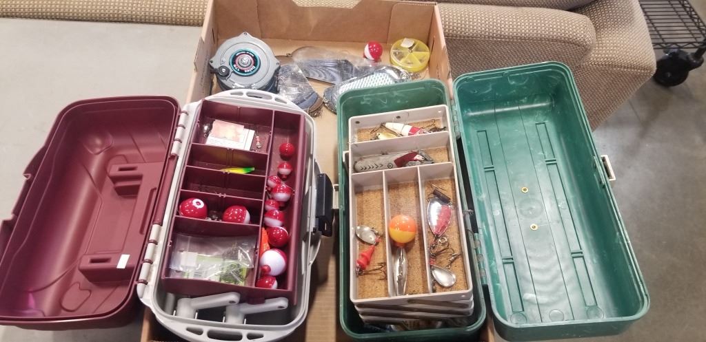 ASSORTED FISHING GEAR, INCLDUING TACKLE BOXES, LURES, DAIWA SALMON REEL ETC