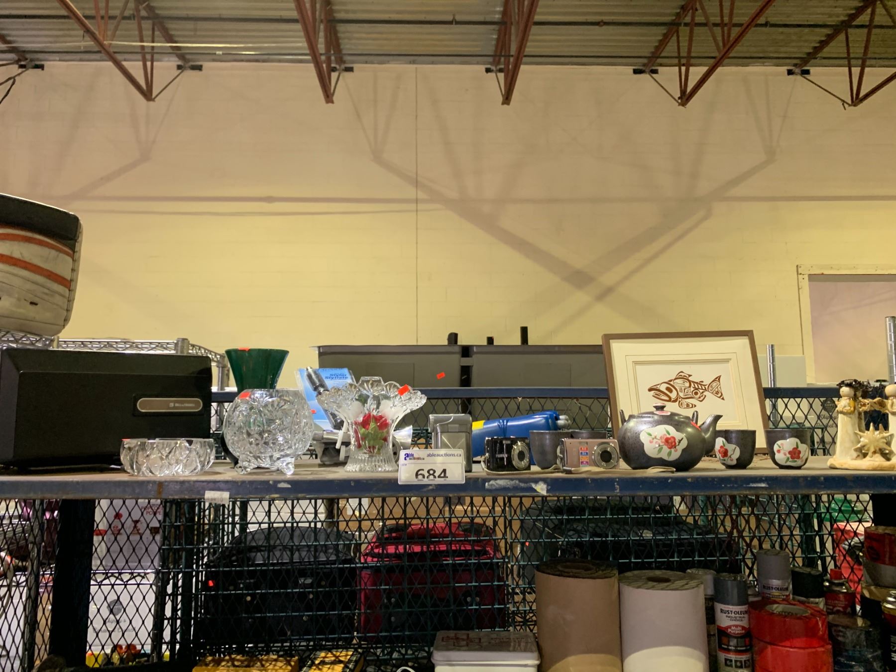 ASSORTED HOME DECOR; TEA SET, FRAMED ART, VASES AND MORE